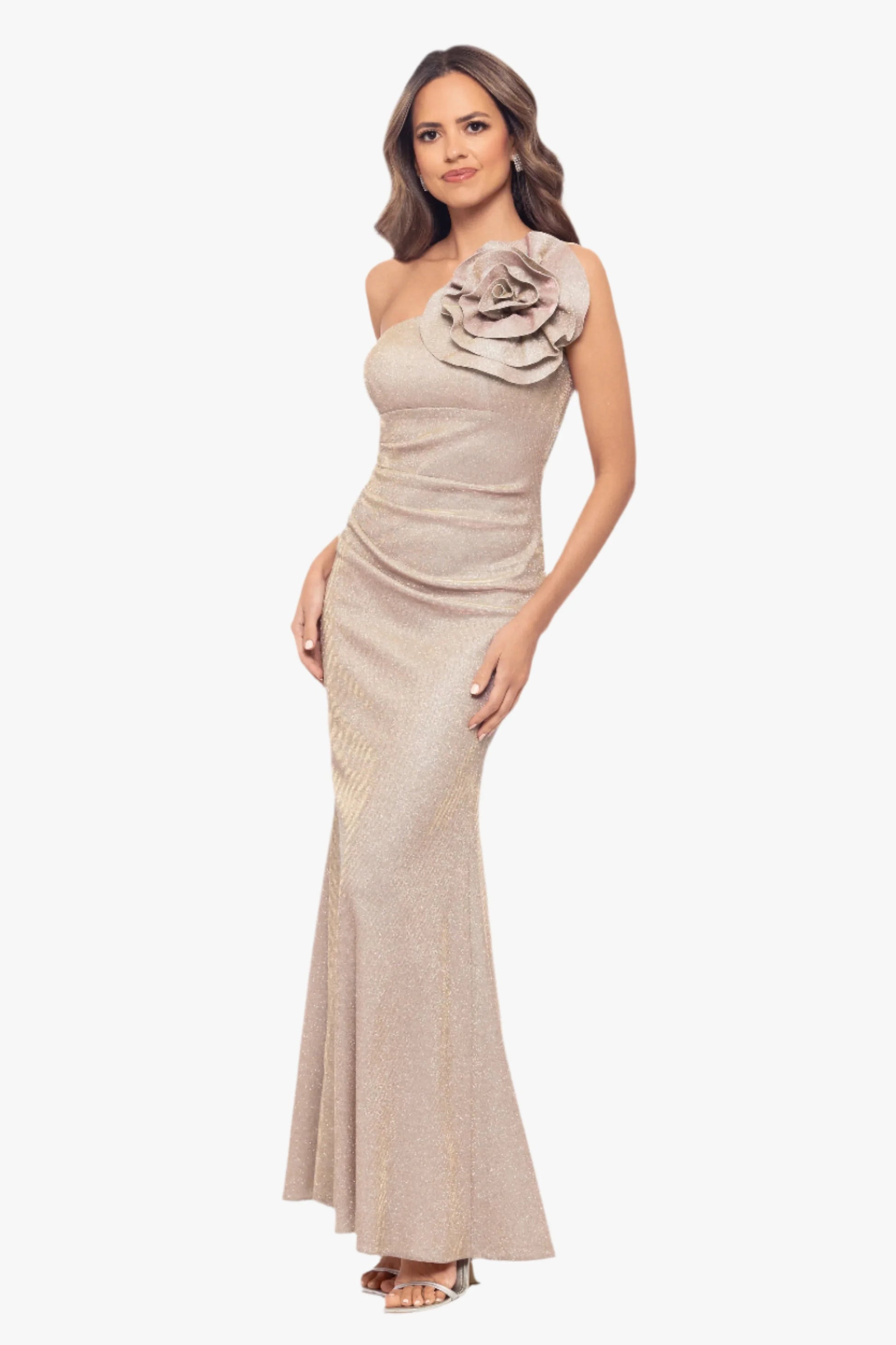 Radiate elegance in this stunning one-shoulder gown, featuring a statement floral accent for a touch of drama. The fitted silhouette is enhanced with soft ruching that flatters your figure, while the subtly shimmering fabric ensures you shine with every step. A sophisticated choice for your next special occasion.
