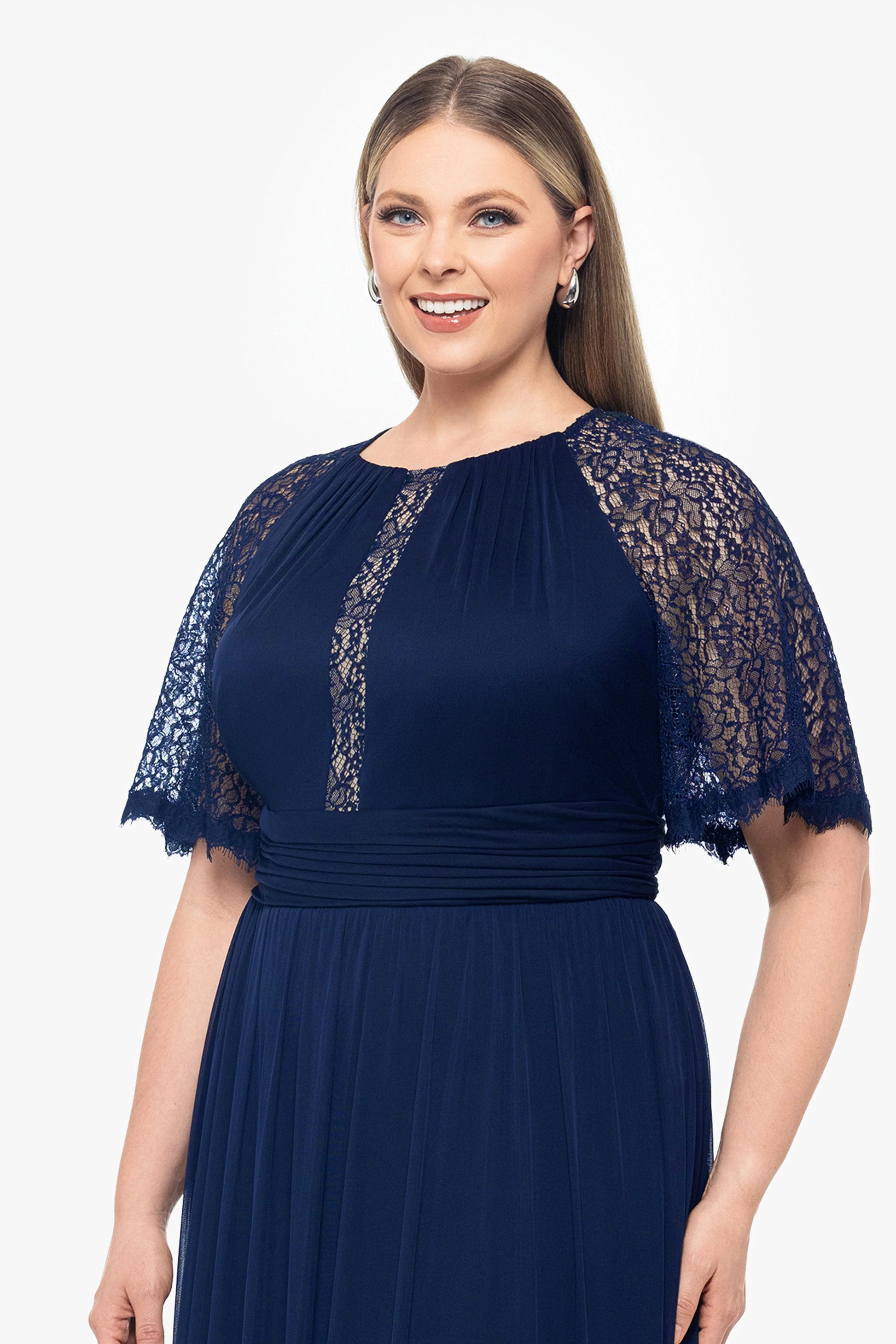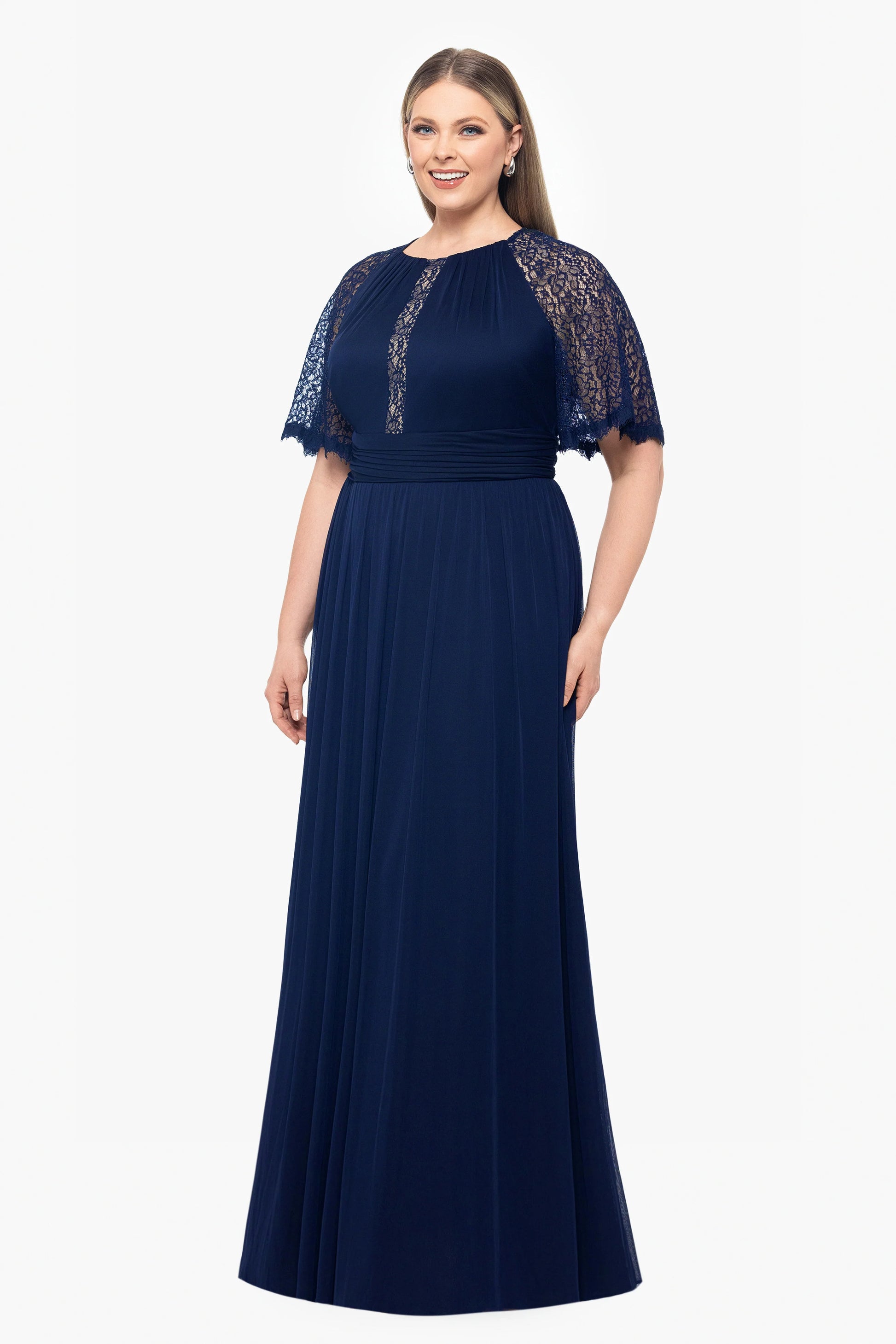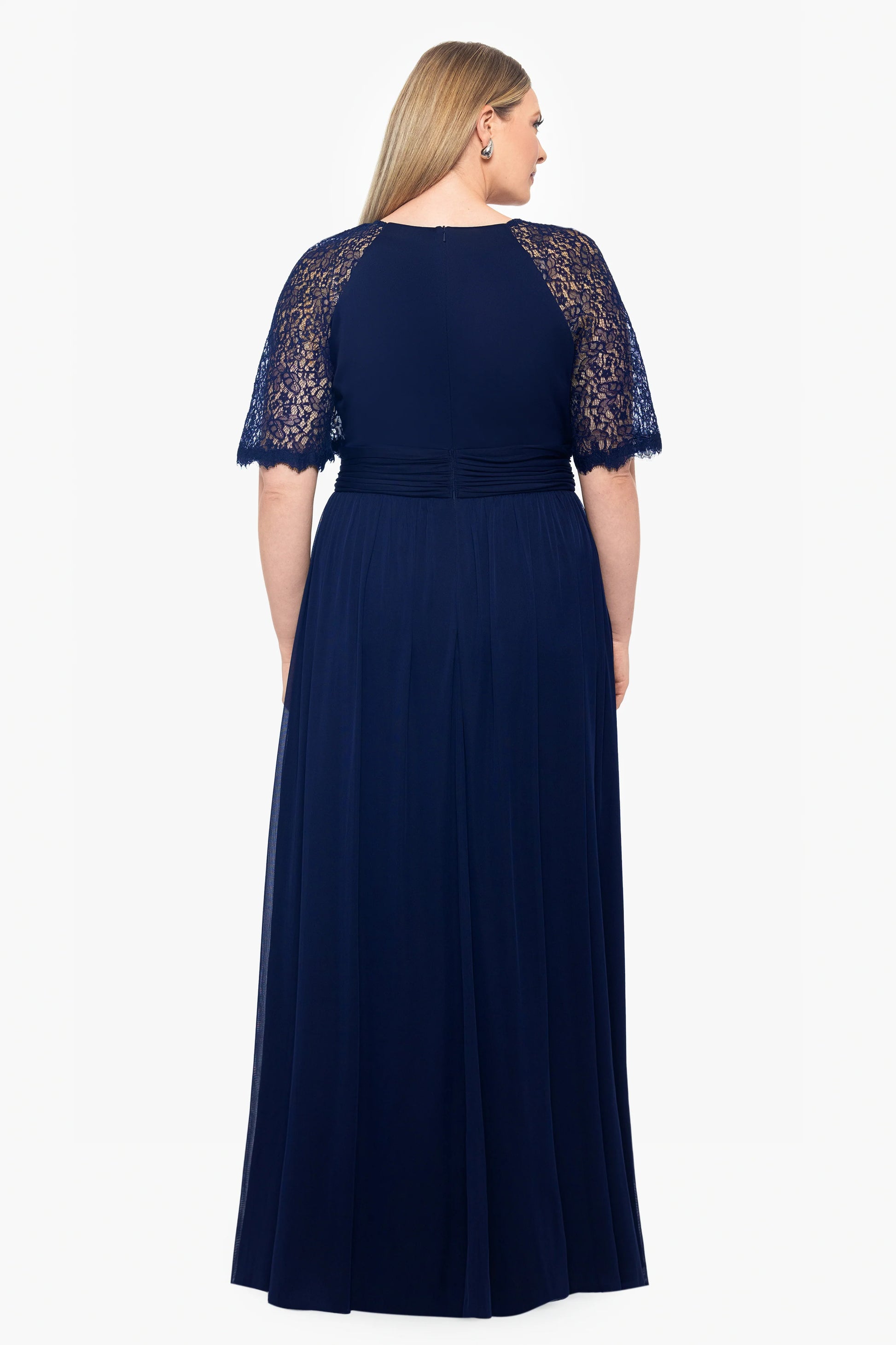 Plus "Chrissy" Long Sheer Matte Jersey and Lace Sleeve Dress