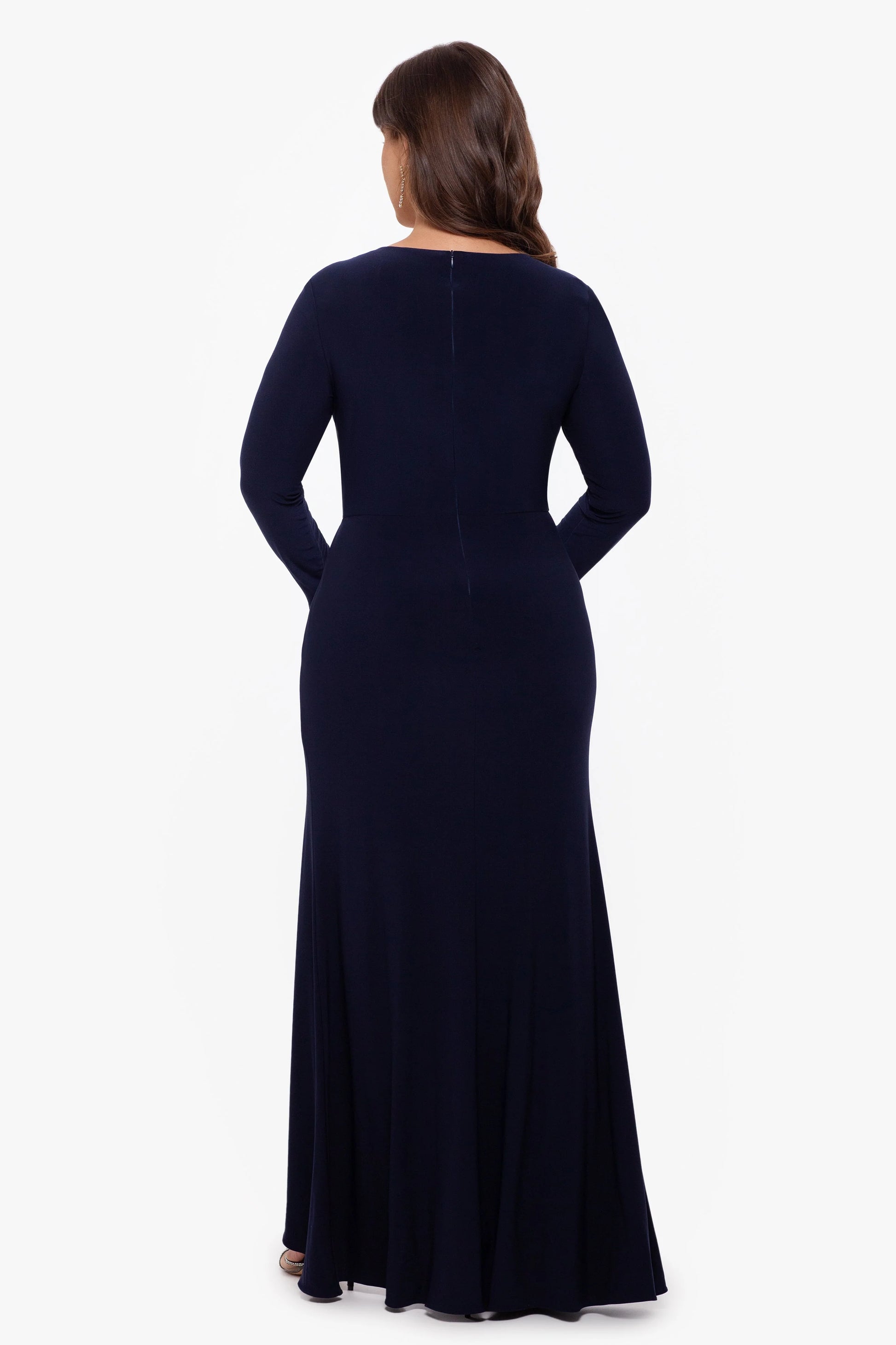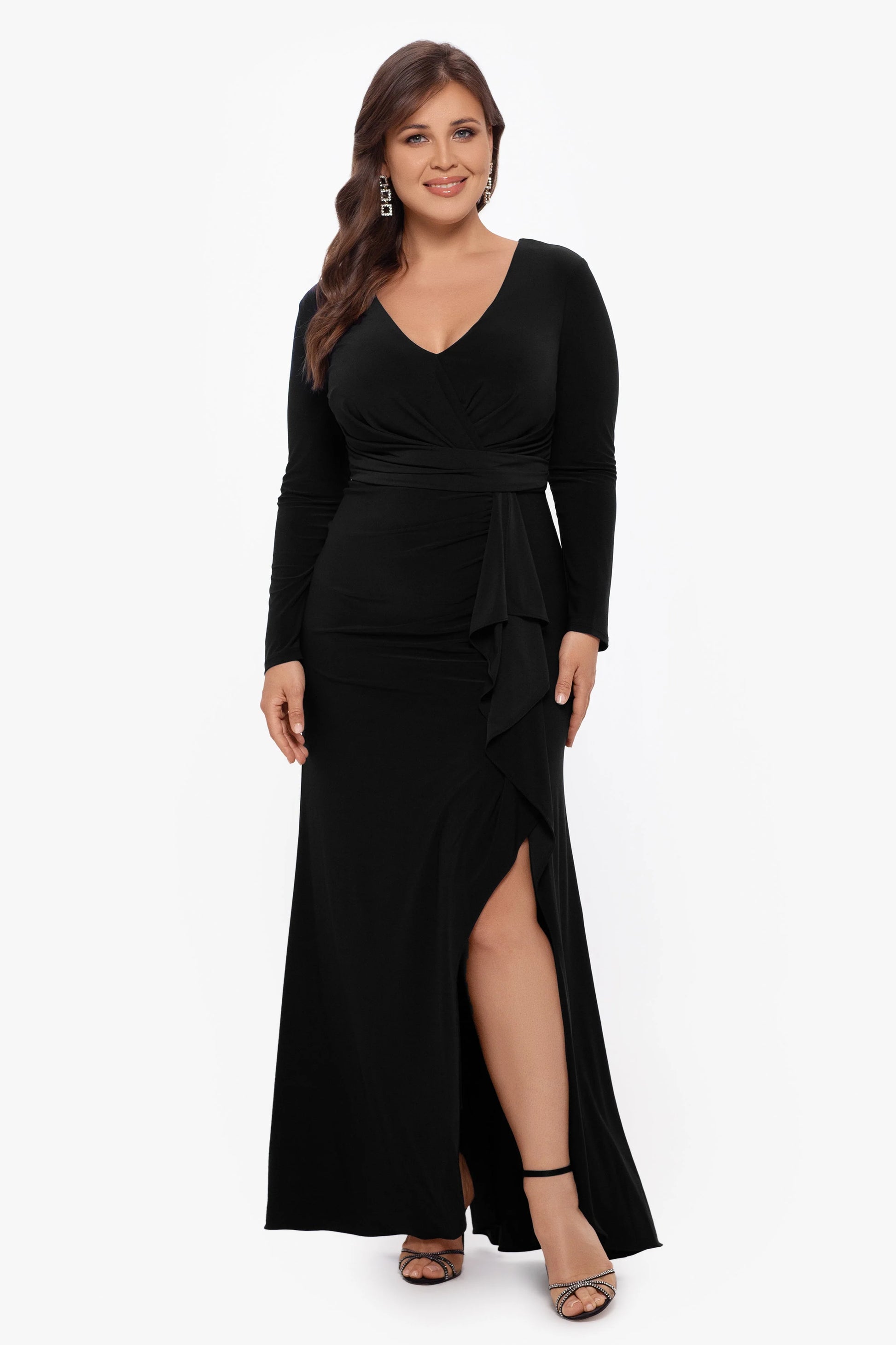 Plus "Elle" Long Sleeve Side Ruffled Slit Gown