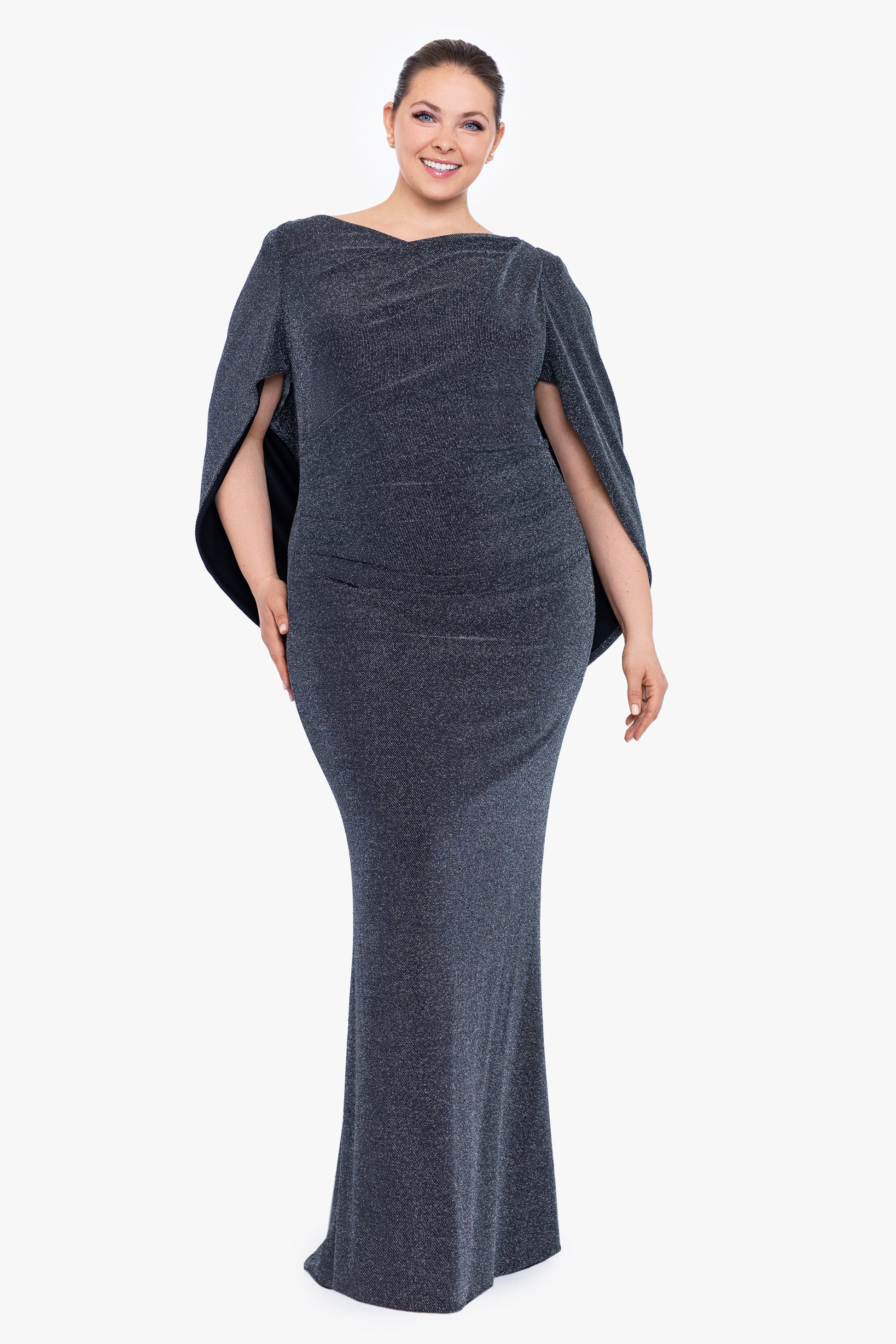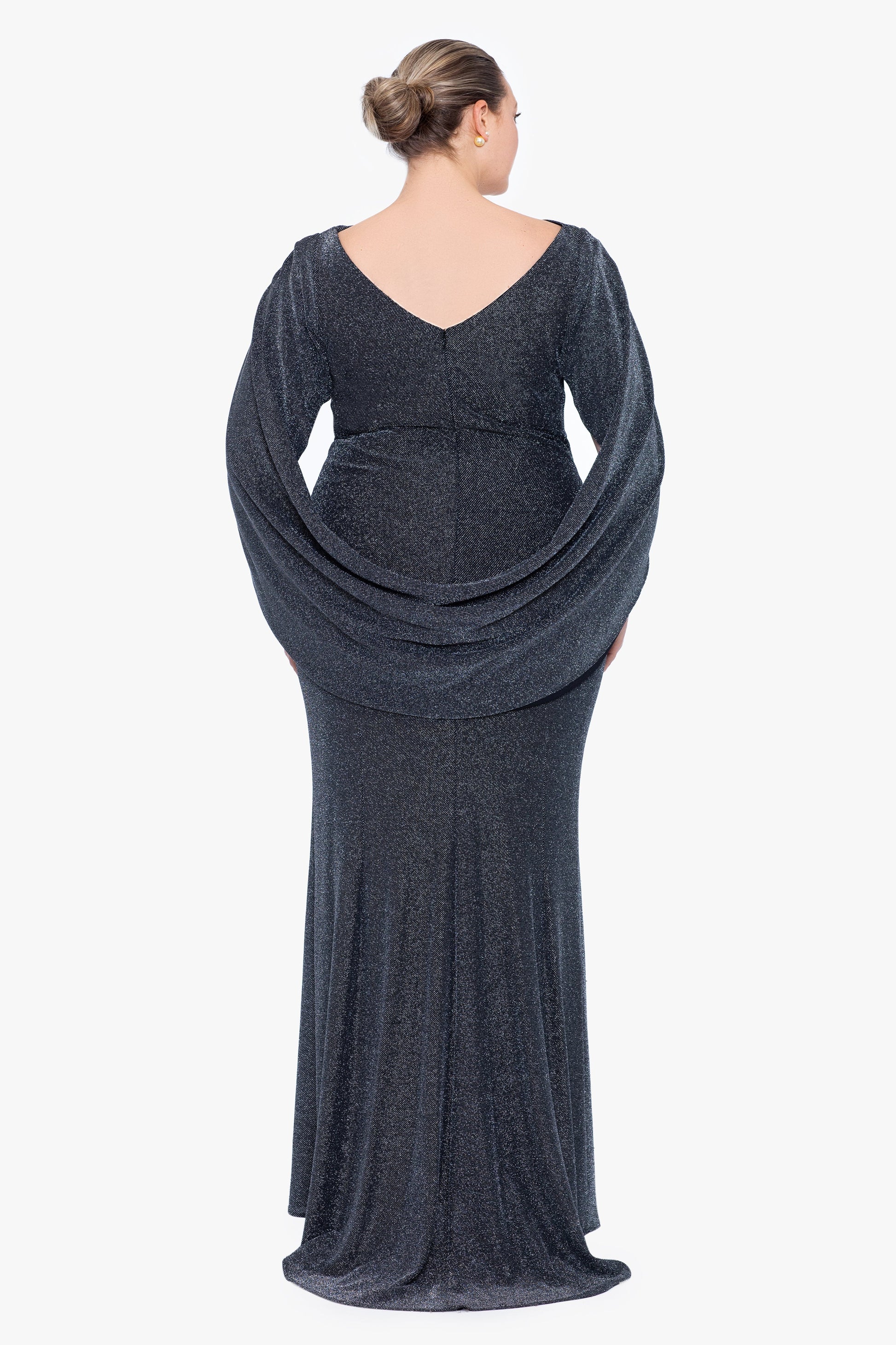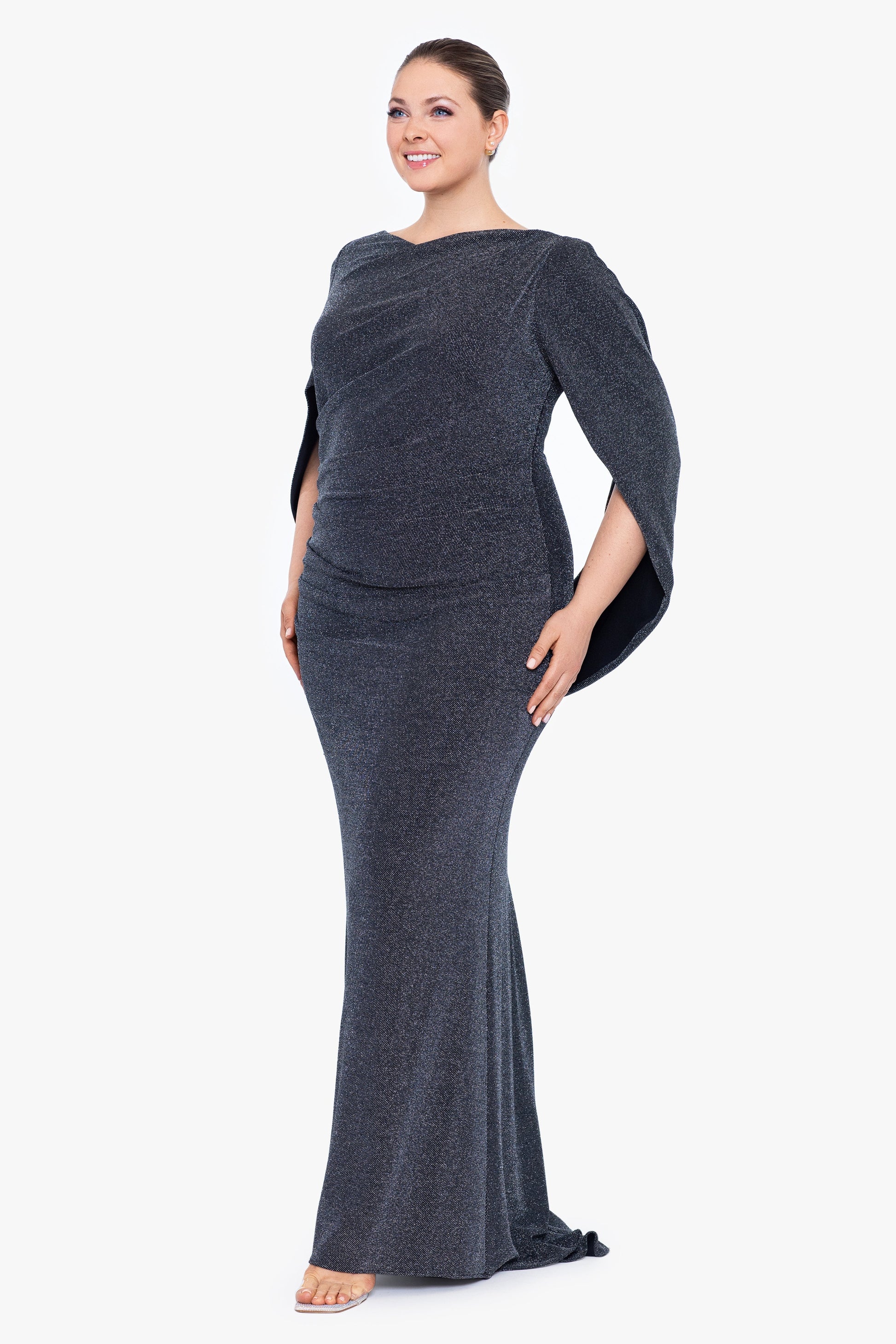 Indulge in pure luxury with our Plus "Jenna" Long Metallic Gown. Featuring a captivating metallic knit, this gown is expertly crafted to drape elegantly down your body, creating a stunning cape-like effect. The long length and ruched details add a touch of sophistication, while the center back zipper ensures a perfect fit. Turn heads at any event in this glamorous statement piece.