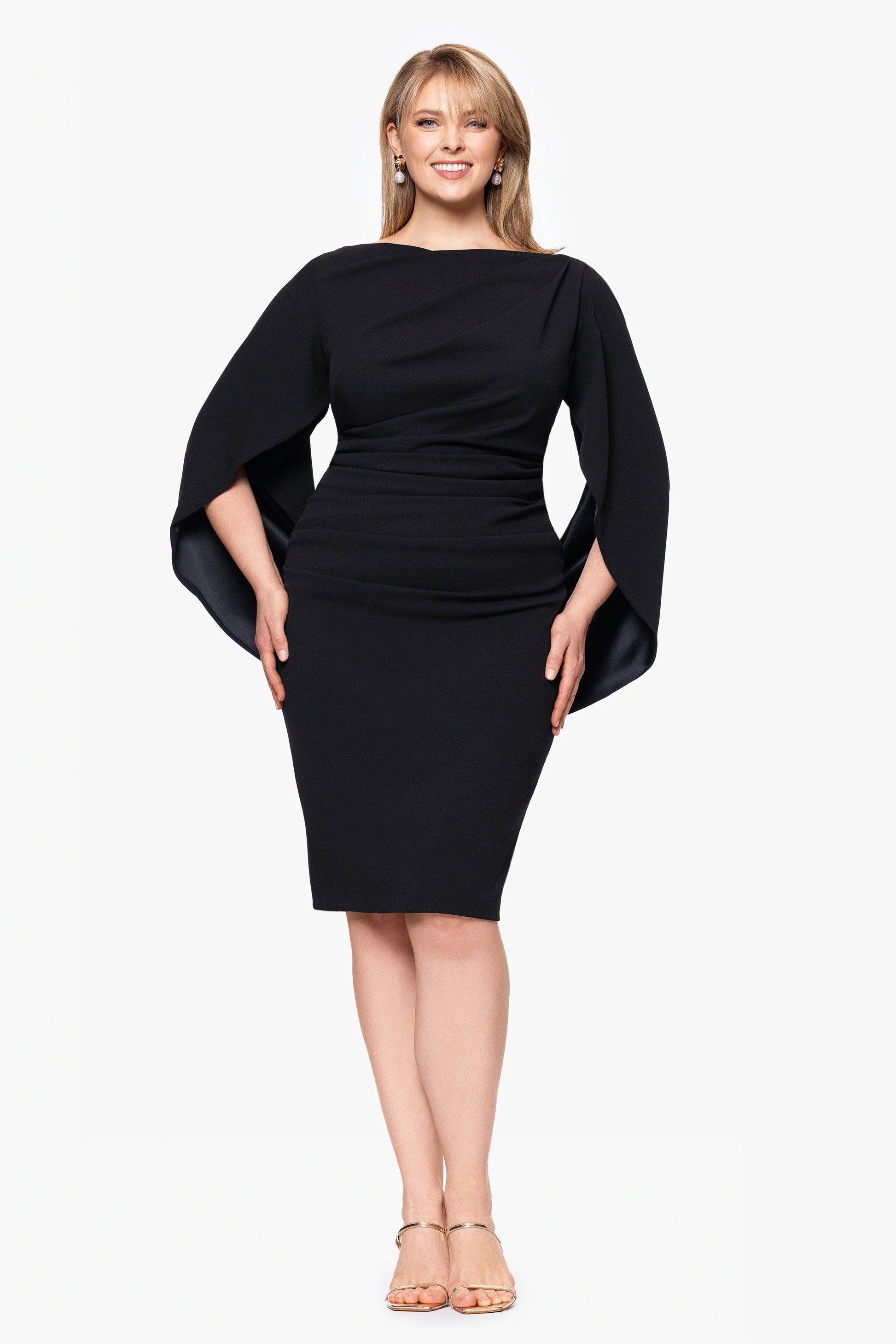 Elevate your style game with the Plus "Jordan" Short Scuba Crepe Drape Back Dress. Made with high-quality scuba crepe material and fully lined for a comfortable fit. Hidden back zipper and draped sleeves add a touch of sophistication while the ruched details and knee length give a flattering silhouette.