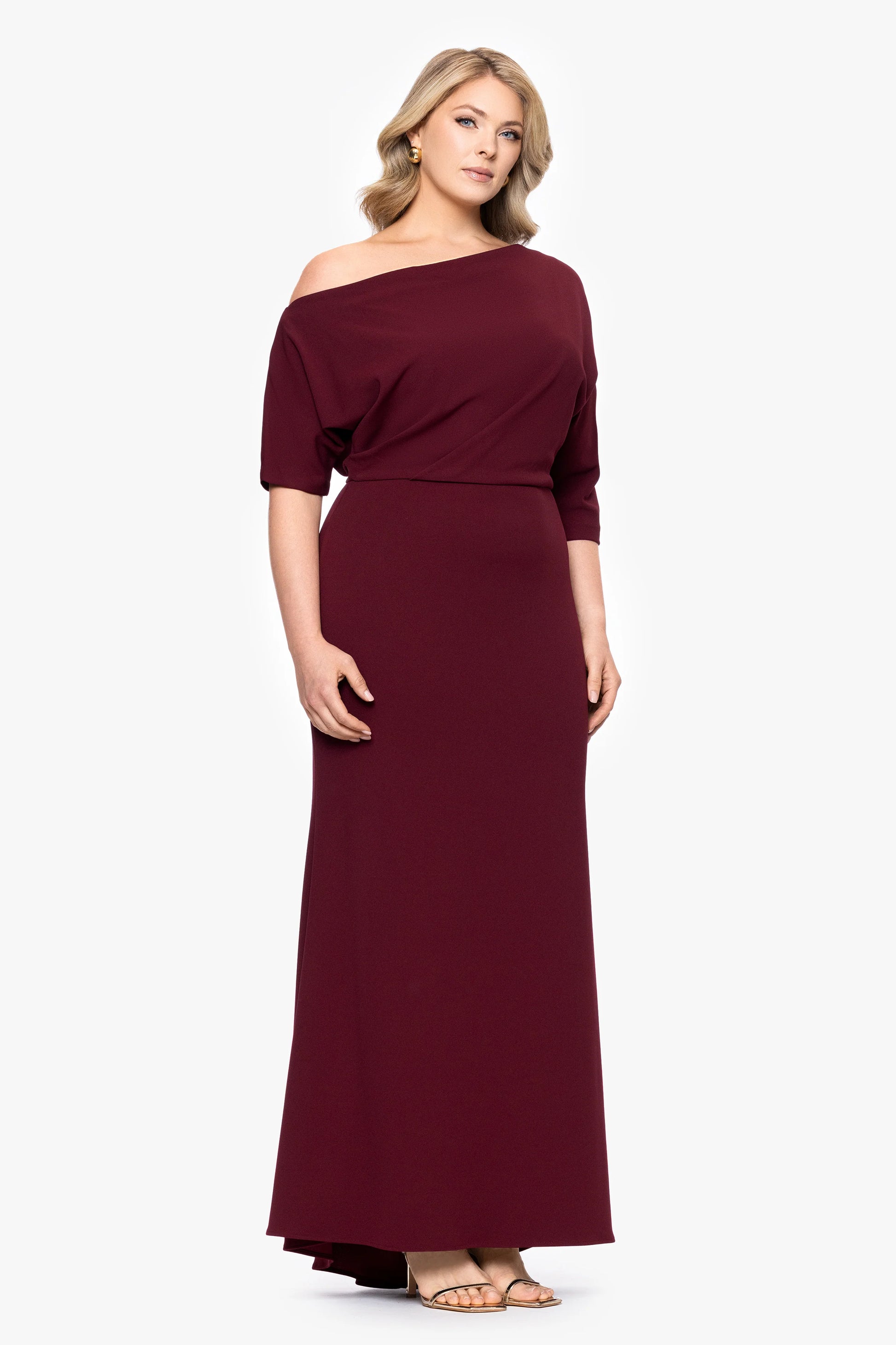 Plus "Madeline" Long Scuba Crepe Off the Shoulder Drop Dress