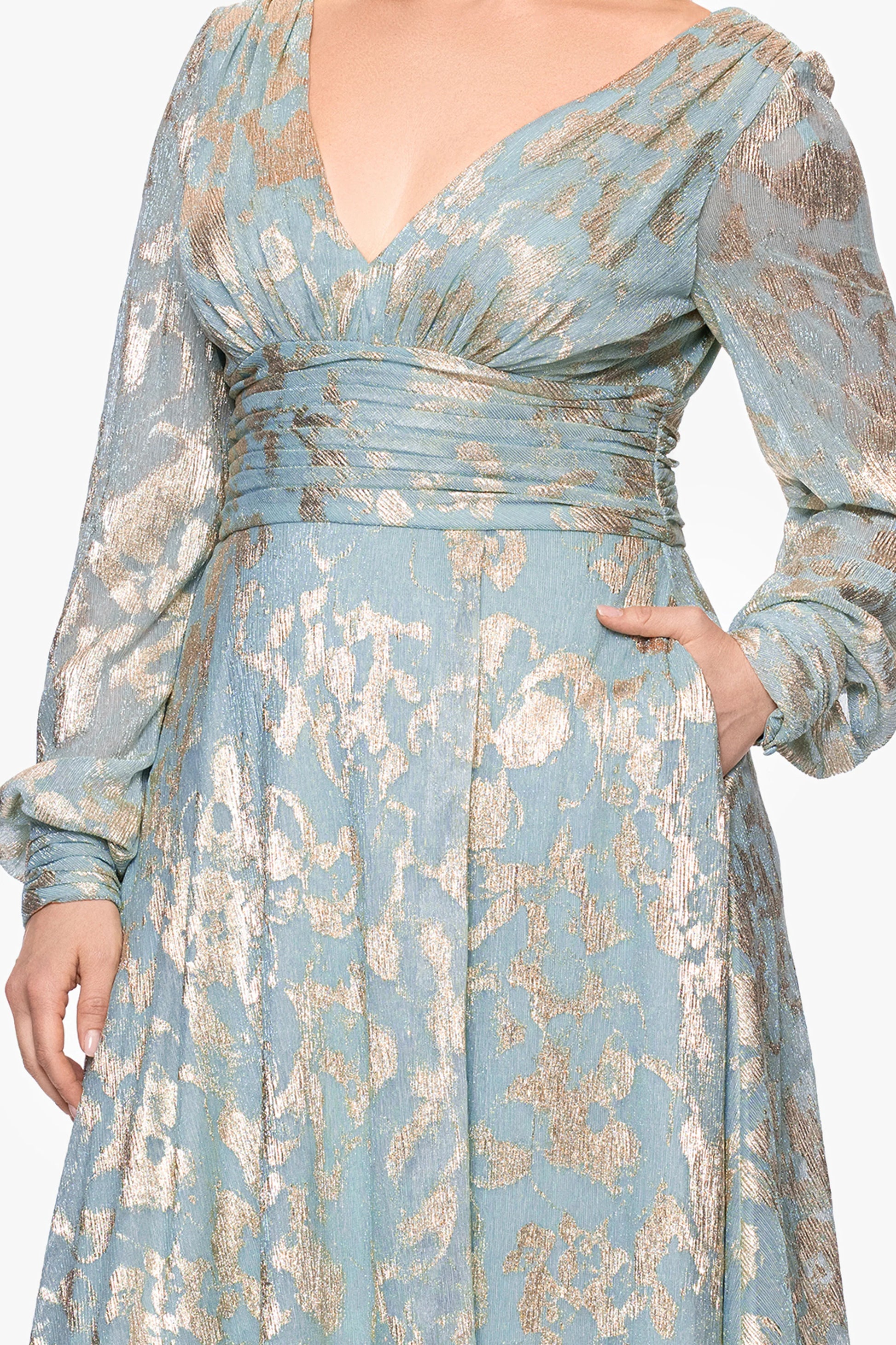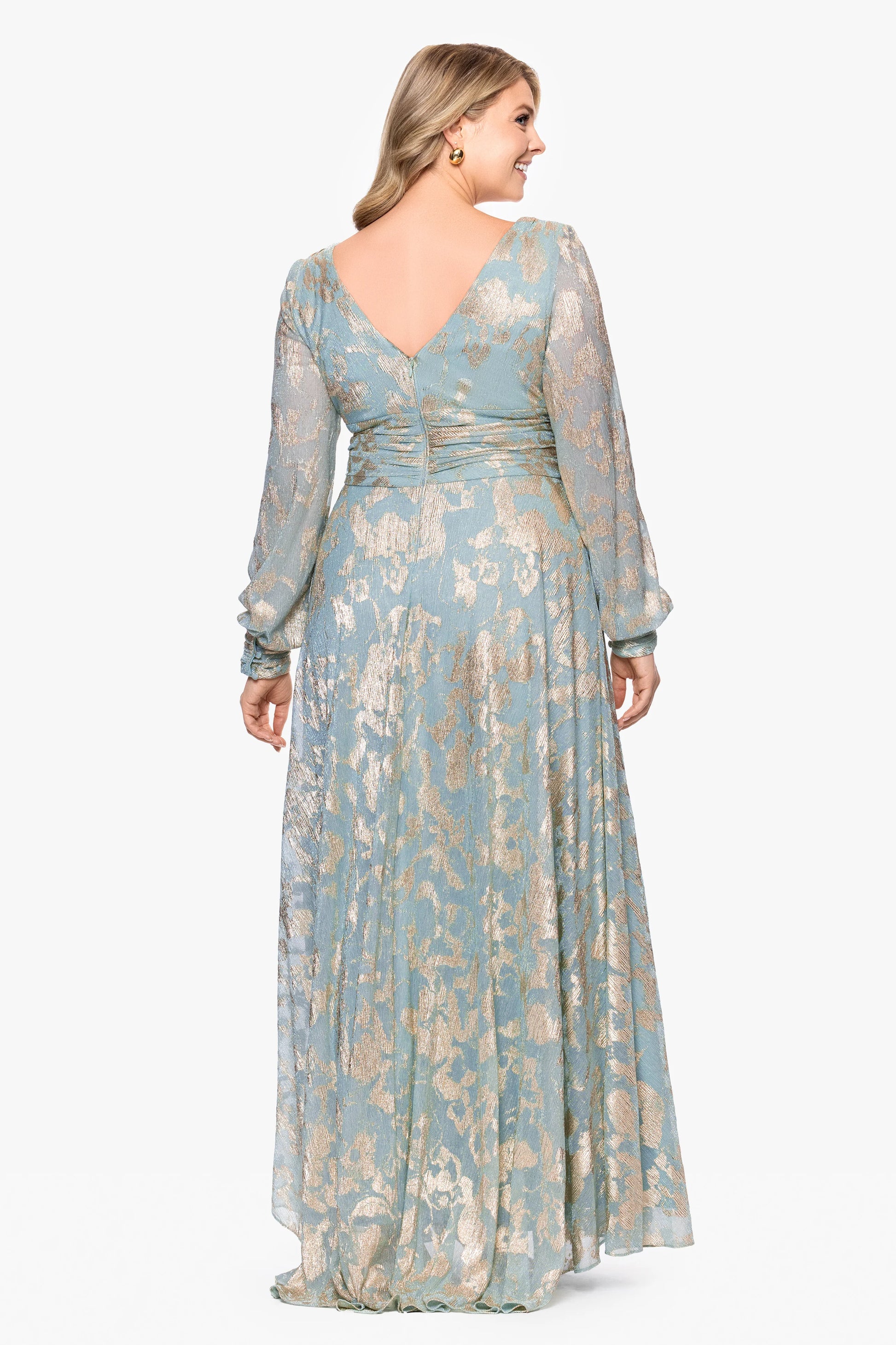 Plus "Melanie" Foil Knit V-Neck Long Sleeve Floor Length Dress