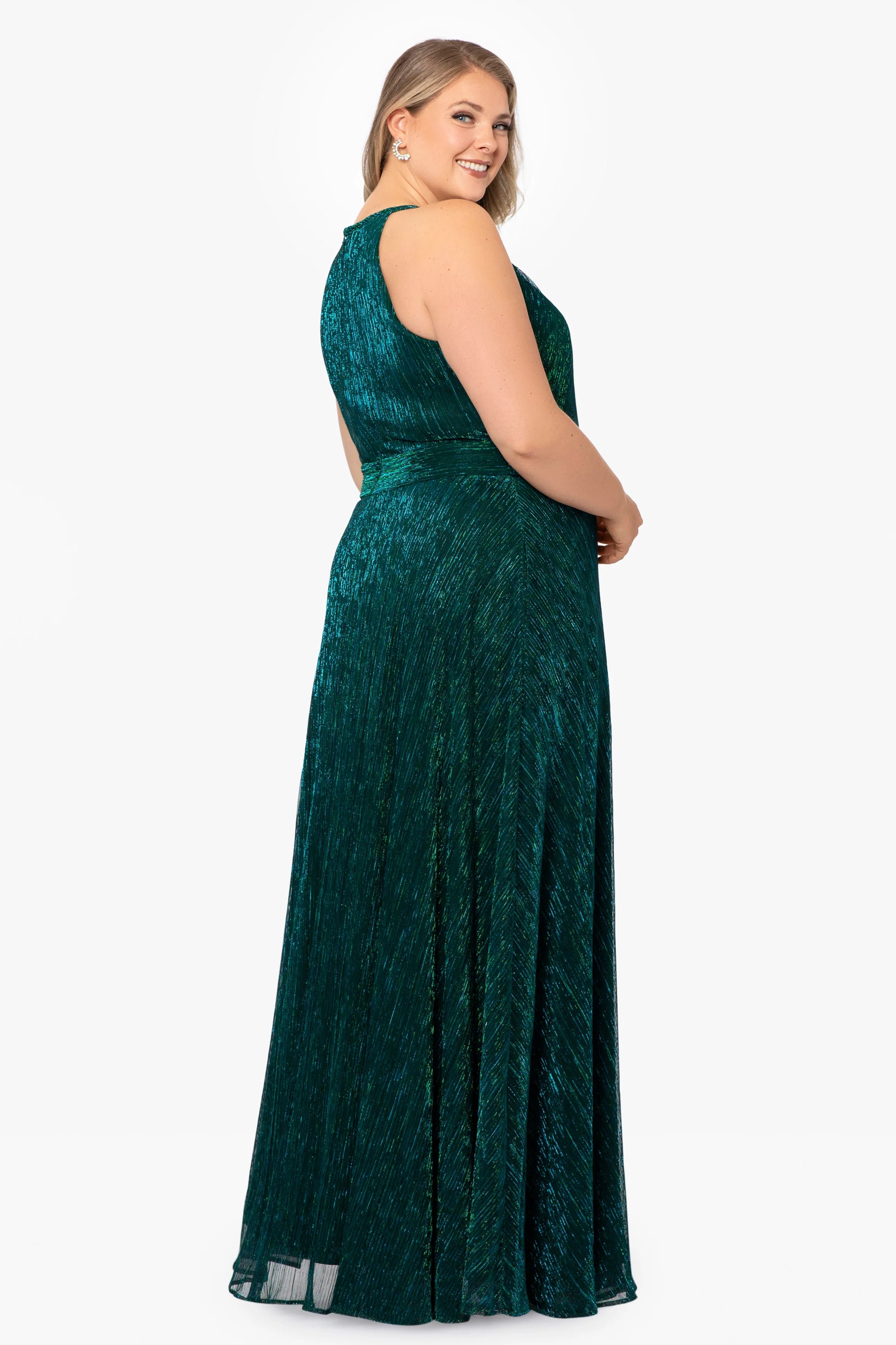 Be the life of the party in the Plus "Mila" Dress! Made with eye-catching metallic crinkle fabric and featuring a flattering halter top, cinched waist, and a playful skirt with a slit. Fully lined and complete with a hidden back zipper, this dress is sure to turn heads (and dance moves)!