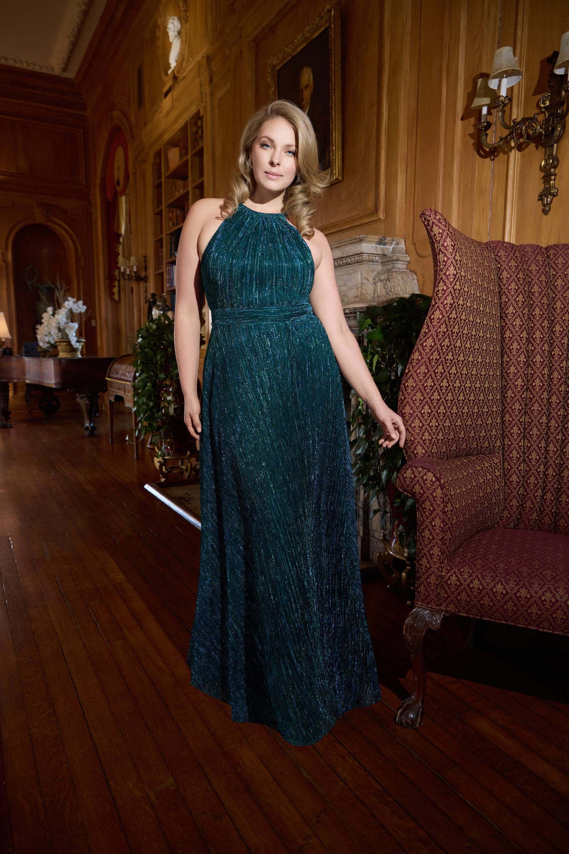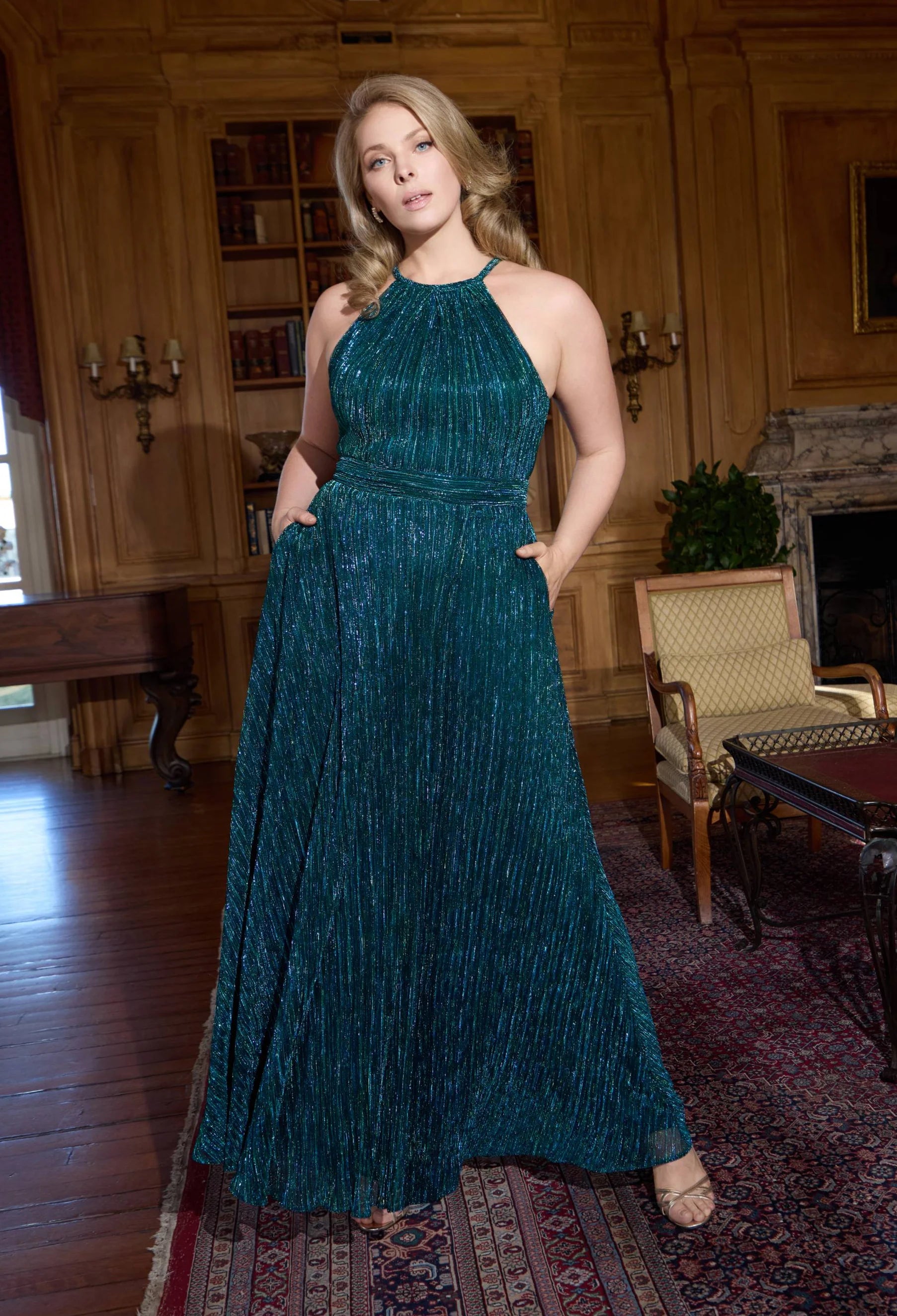 - Details: Halter Top, Cinched Waist, Metallic, Skirt with Slit