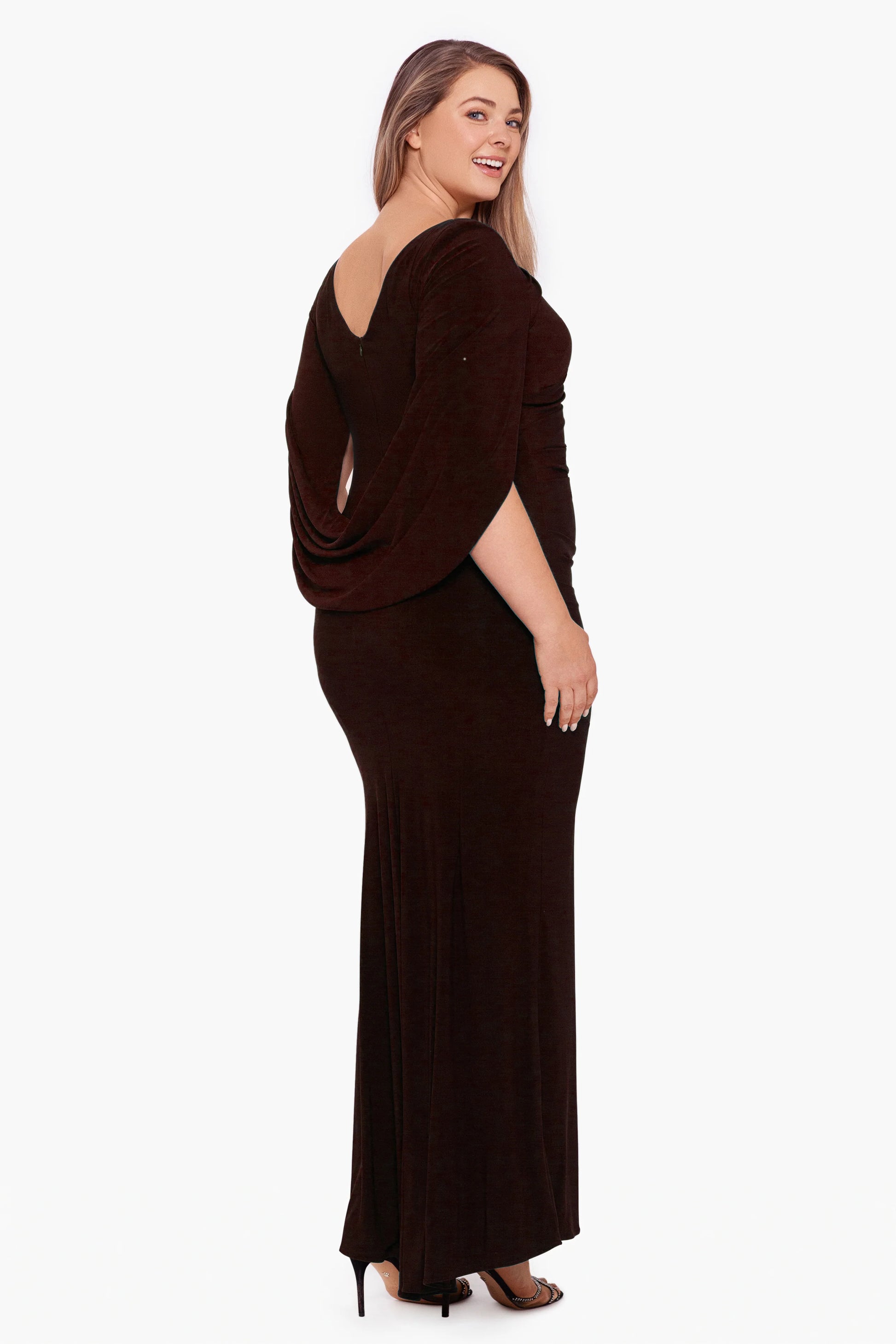 Introducing the Plus "Miriam" Long Knit Draped Gown - the perfect blend of comfort and style. Made from Ity material and fully lined, it features drape sleeves, a low back, and a hidden back zipper for a seamless, stunning look. Get ready to turn heads (and feel amazing) in this long dress.