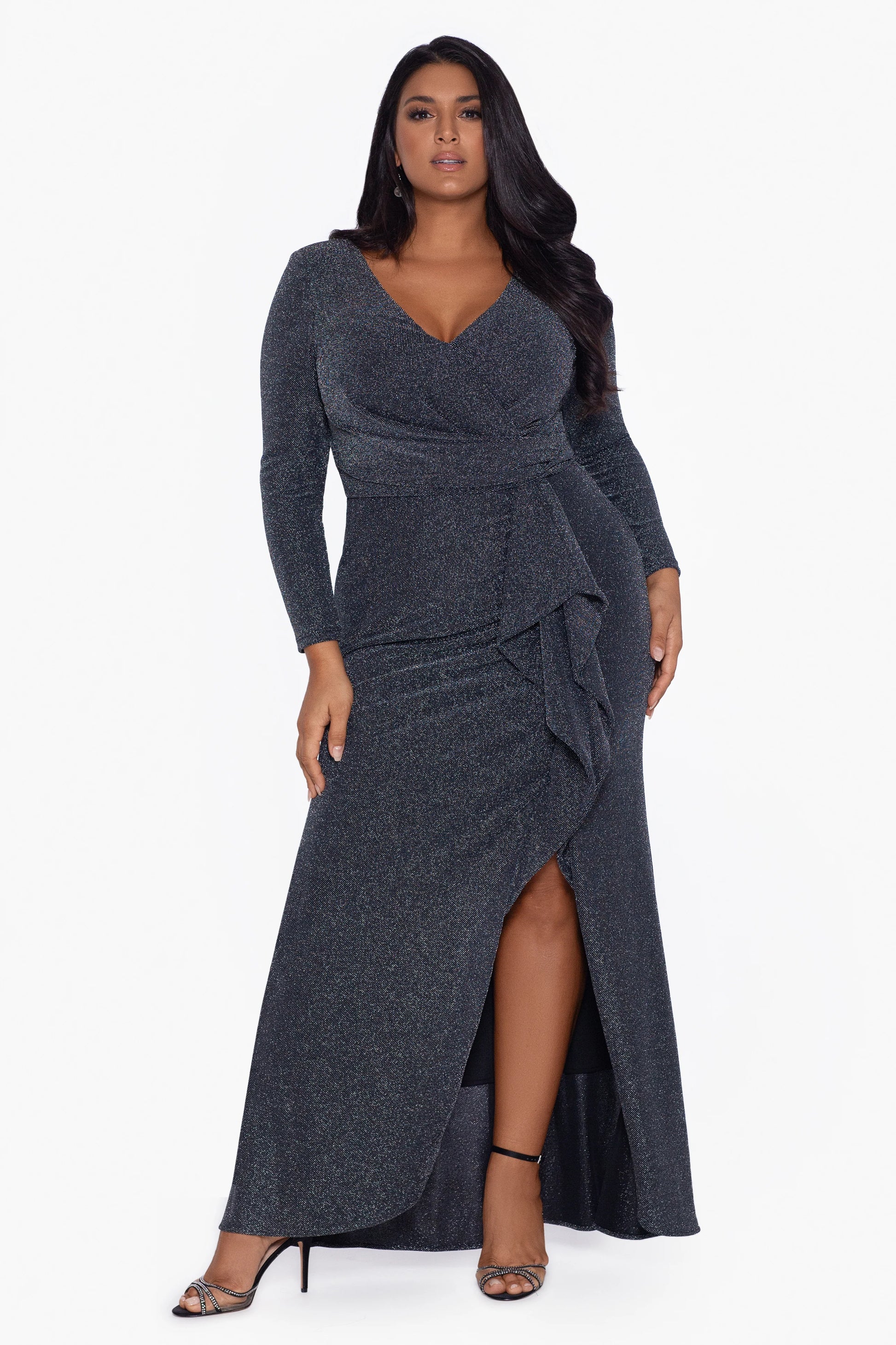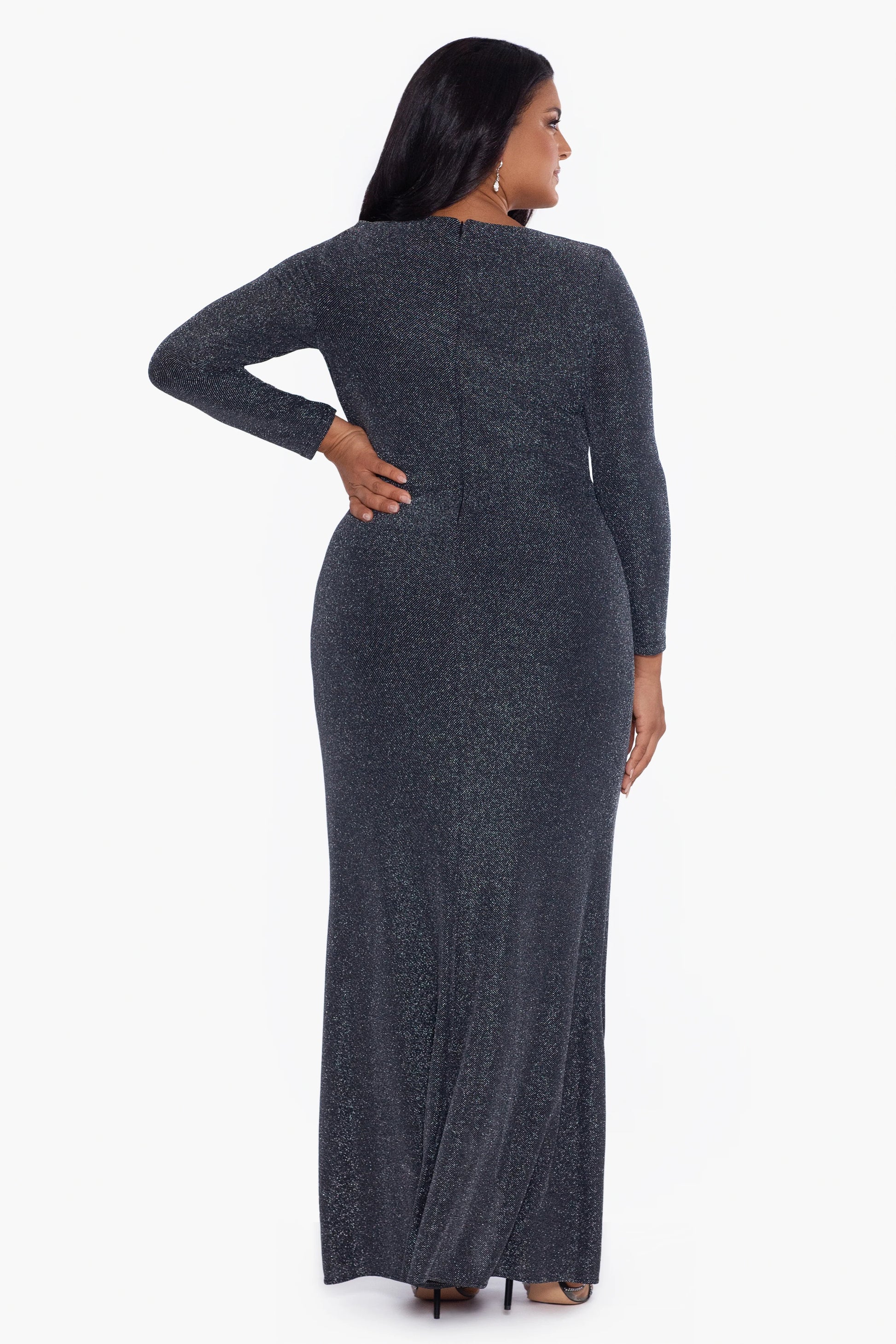 Plus "Rhonda" V-Neck Metallic Knit Long Dress