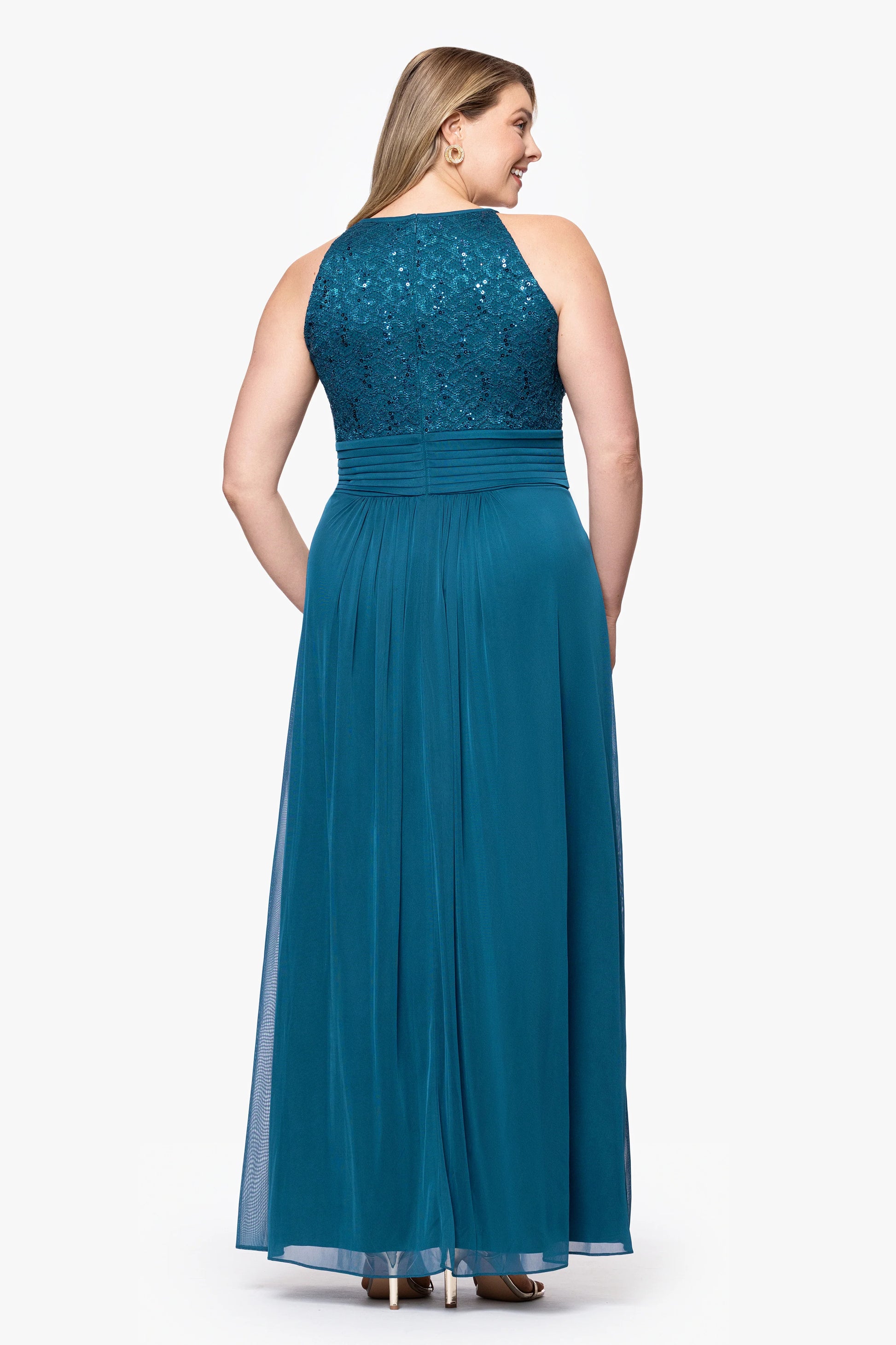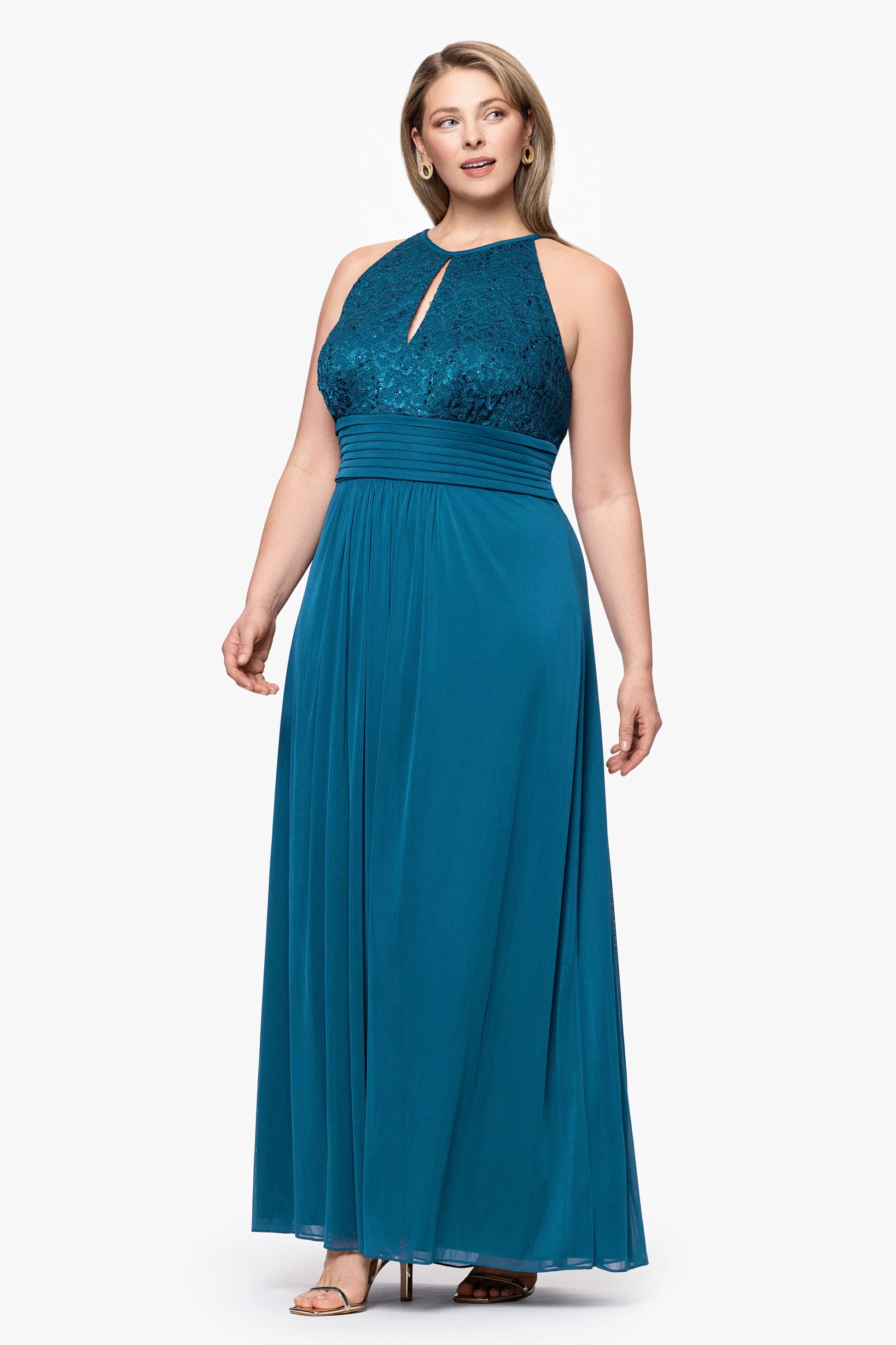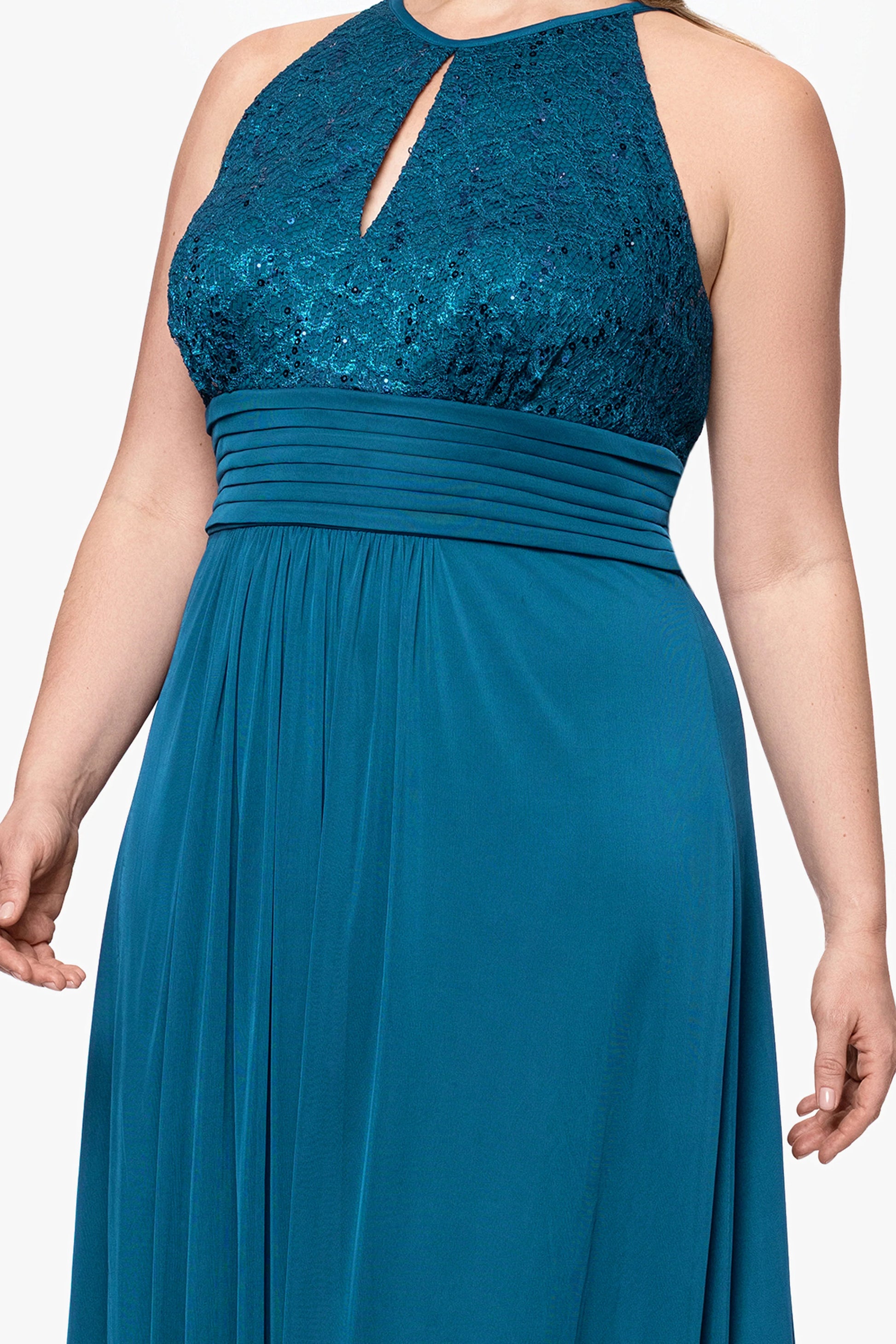 Plus "Selena" Jersey and Lace Halter Keyhole Neck Floor Length Dress