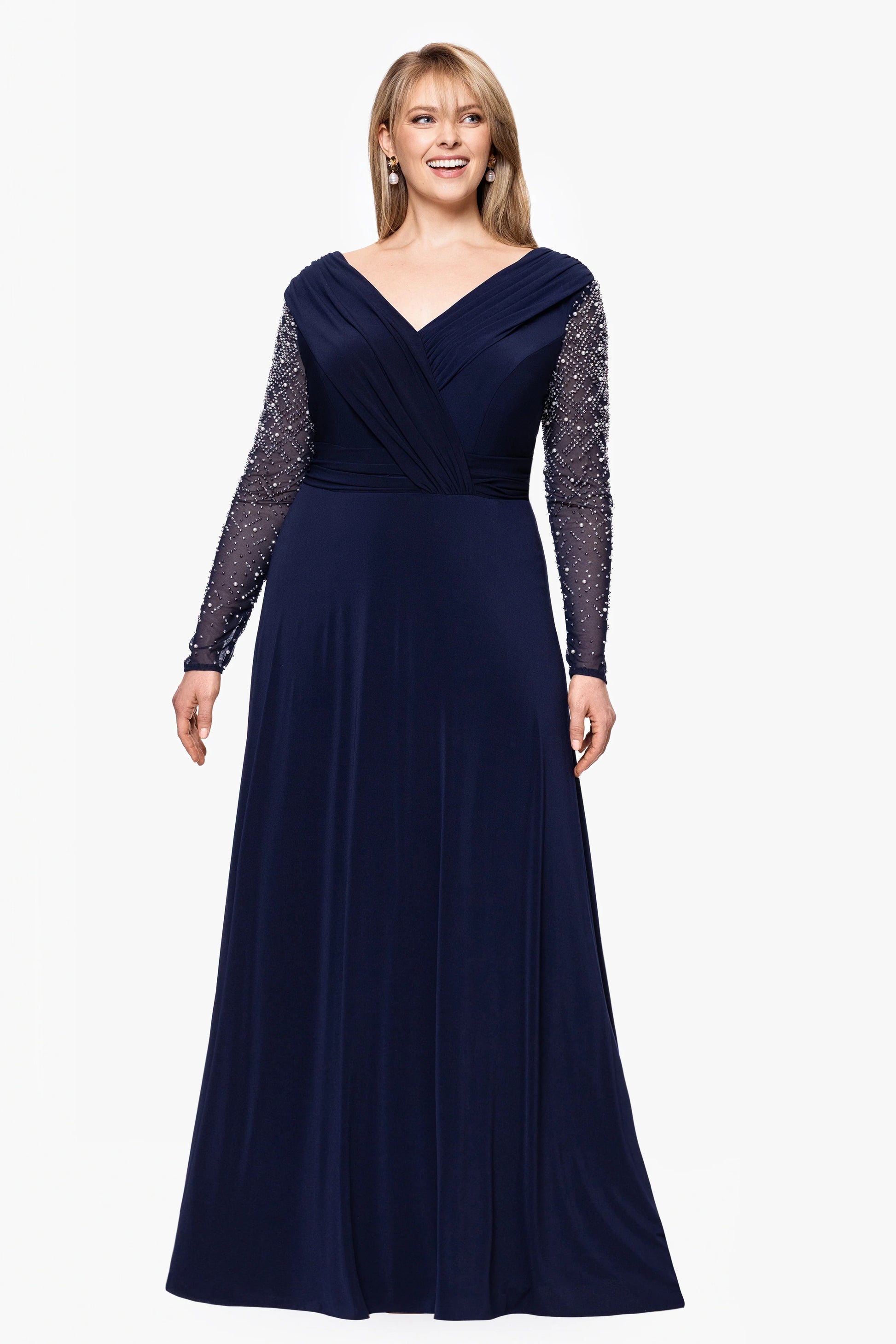 Plus "Sharleen" Jersey Knit Beaded Long Sleeve Floor Length Dress