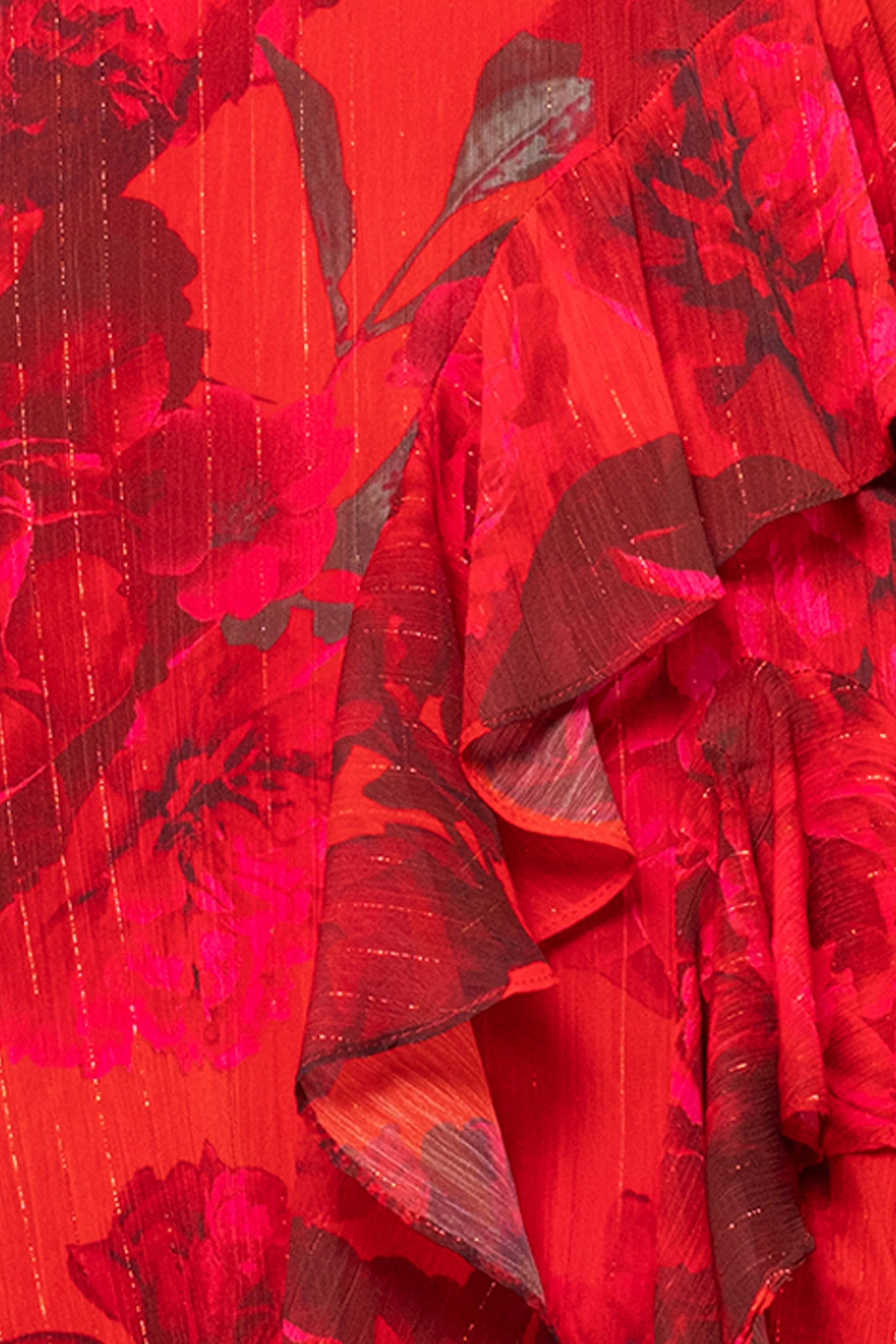 Make a bold statement in this vibrant floral gown, featuring delicate ruffle details, a high neckline, and an asymmetrical cascading skirt. Its lightweight, flowy fabric and rich floral pattern create a striking, romantic look—perfect for weddings and special occasions.