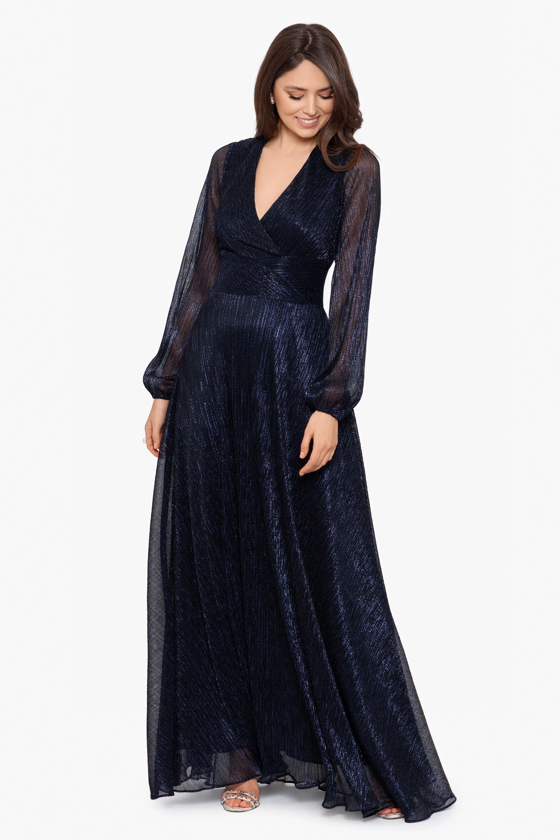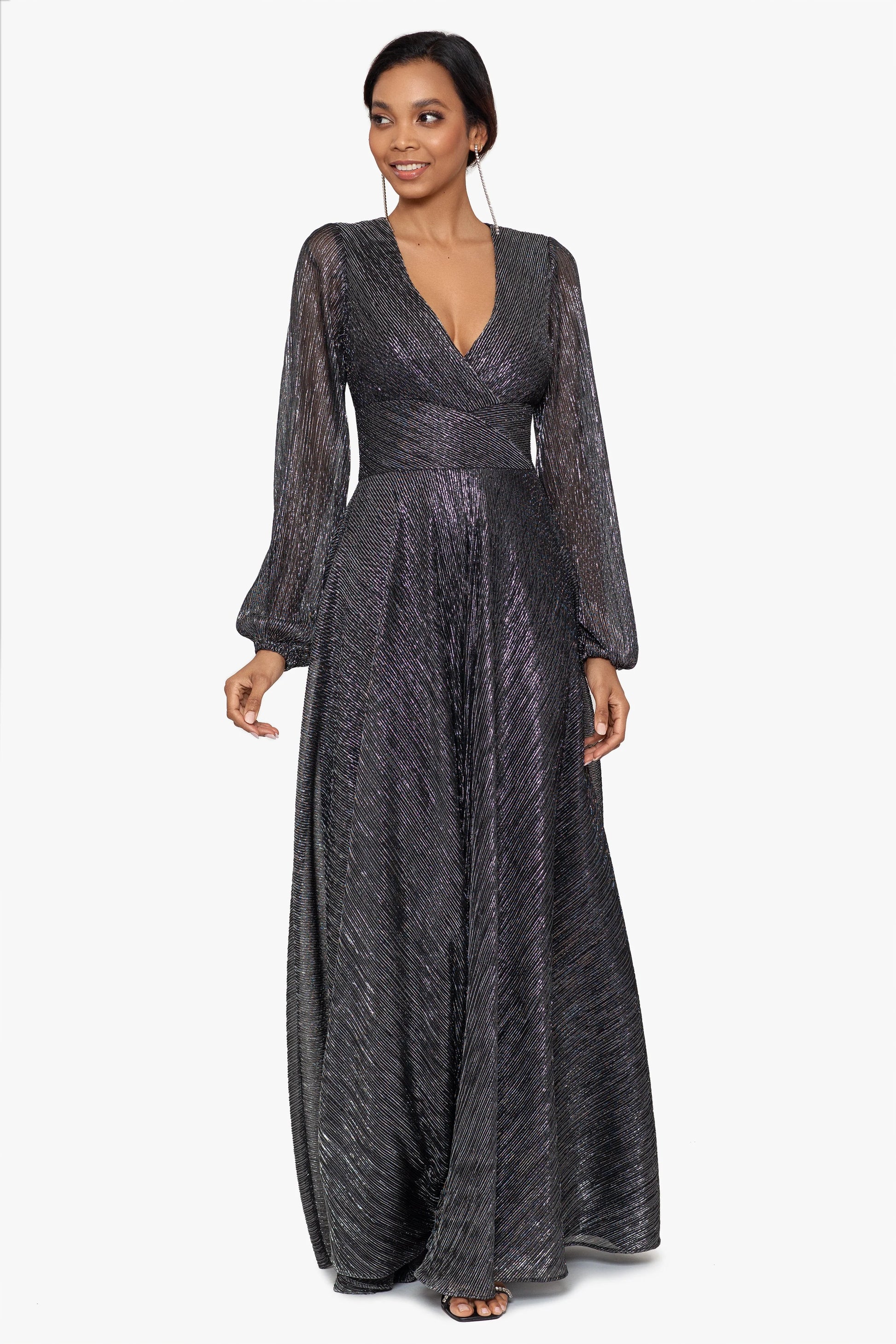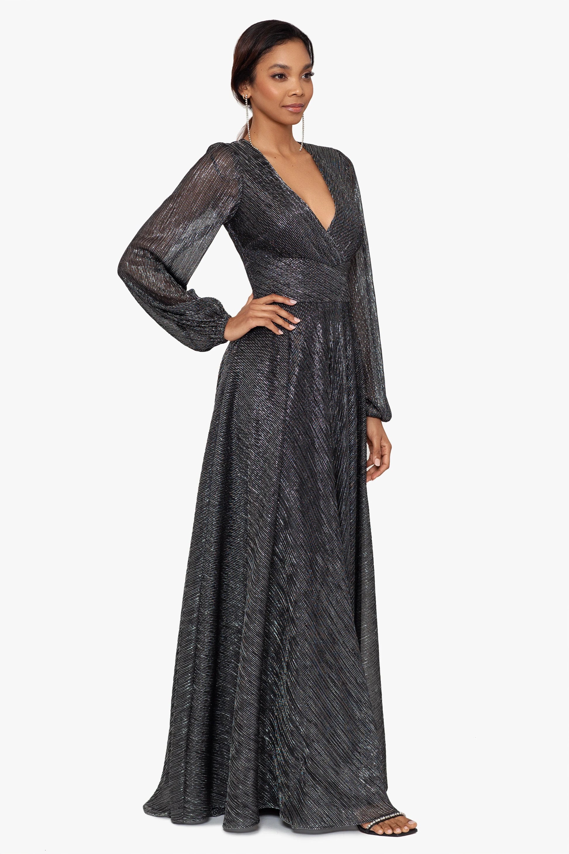 - Details: Floor Length Gown, Waist Wrap, Long Sleeve Dress