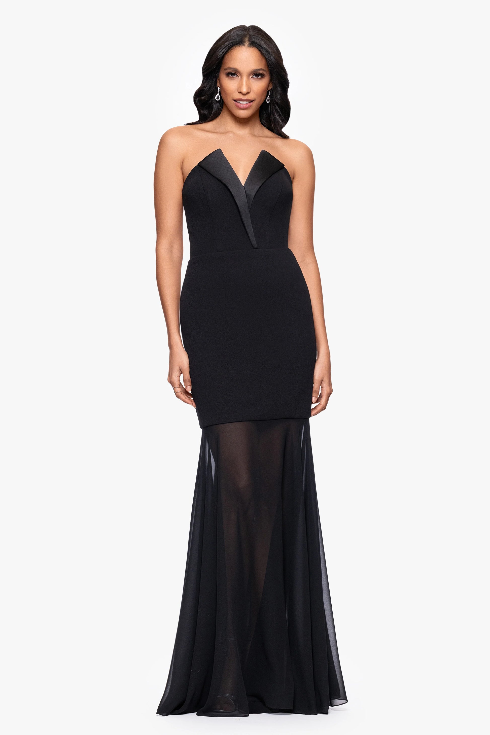 Chic and daring, this strapless gown features a structured notch neckline, a curve-hugging silhouette, and a sheer chiffon mermaid skirt that adds drama and elegance with every step.