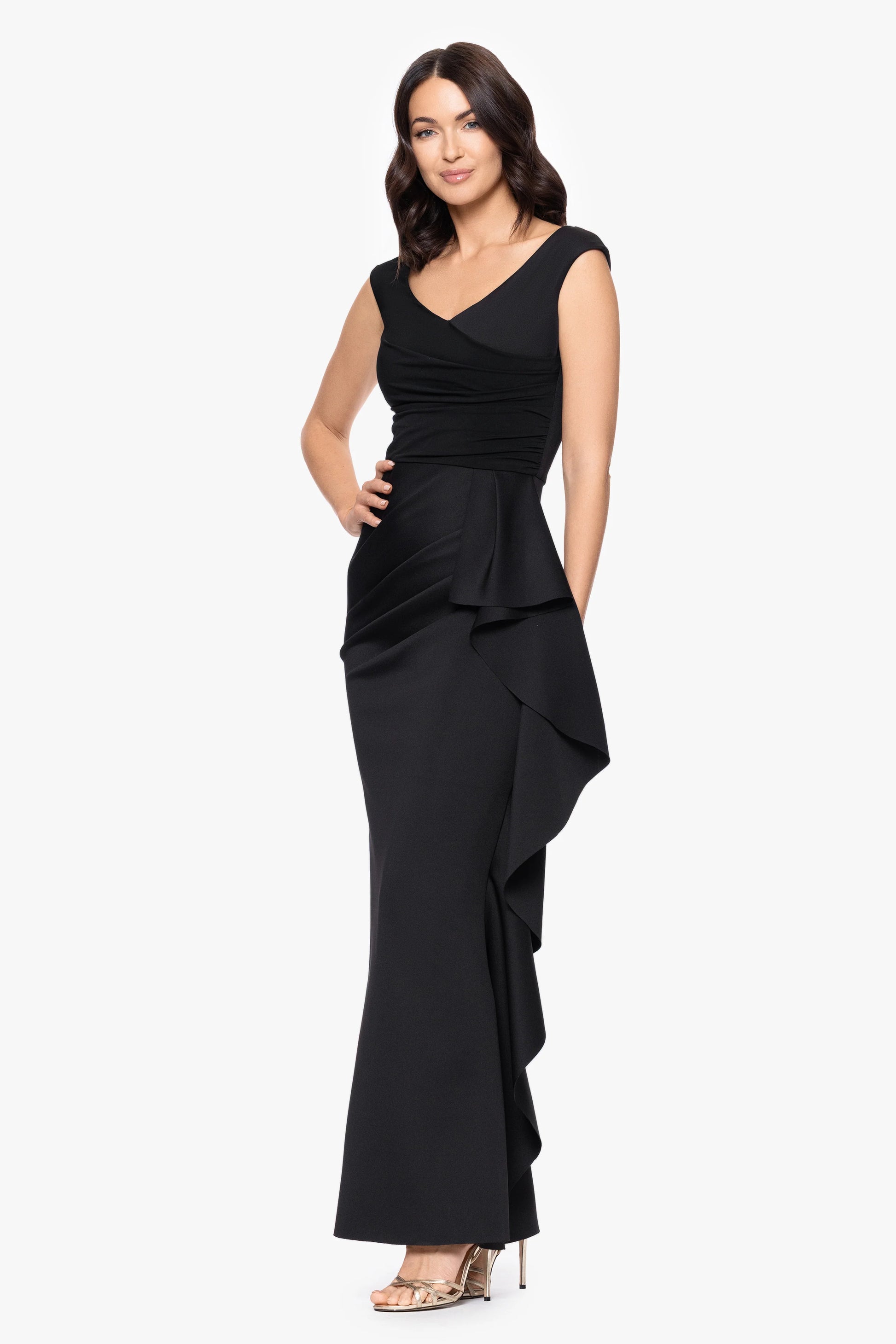 "Ruth" Techno Scuba Sleeveless V-Neck Ruffle Floor Length Dress