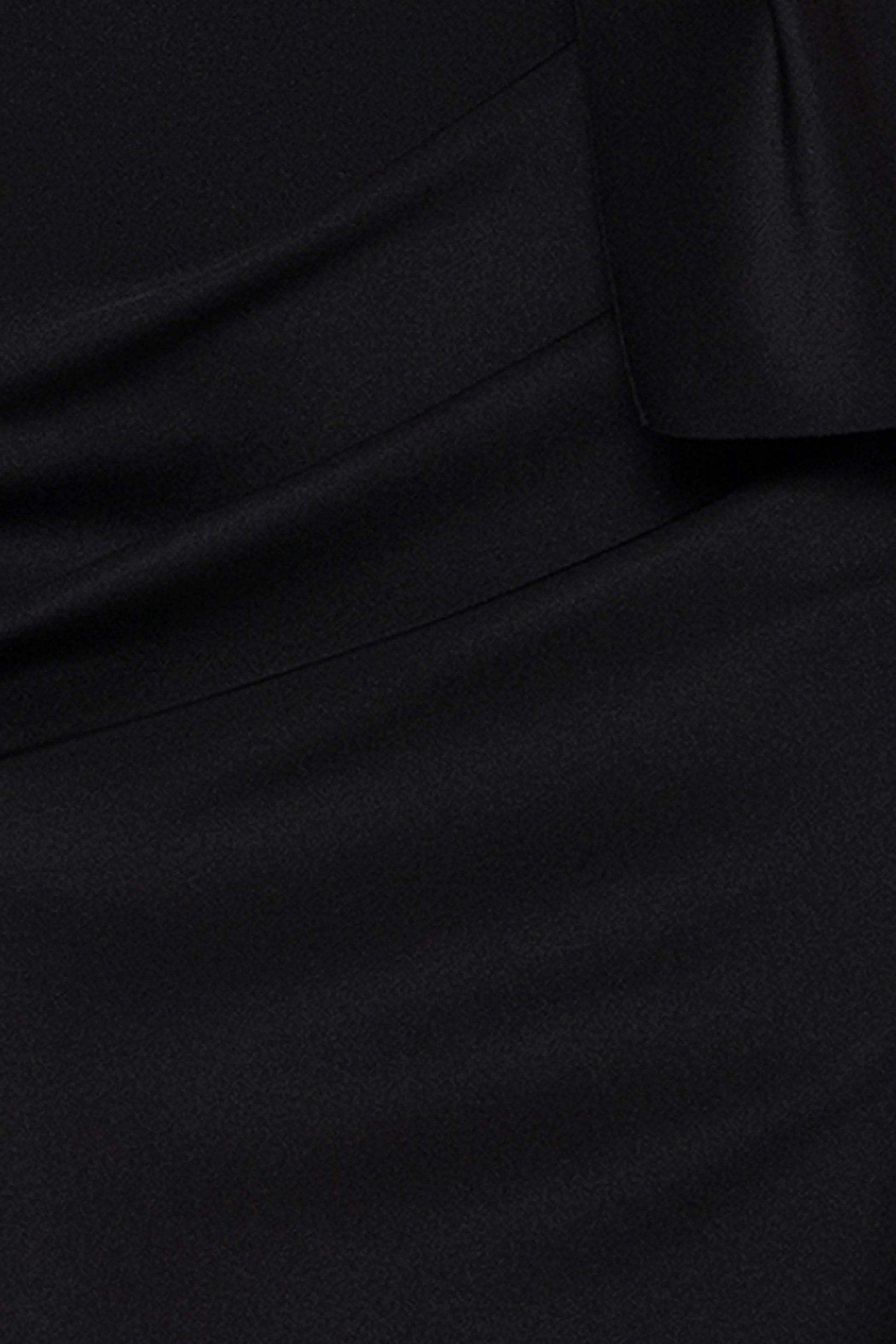 This black evening gown features a flattering ruched bodice, asymmetric neckline, and dramatic cascading ruffle detail. The fitted silhouette and floor-length skirt make it a sophisticated choice for weddings, galas, or formal celebrations.