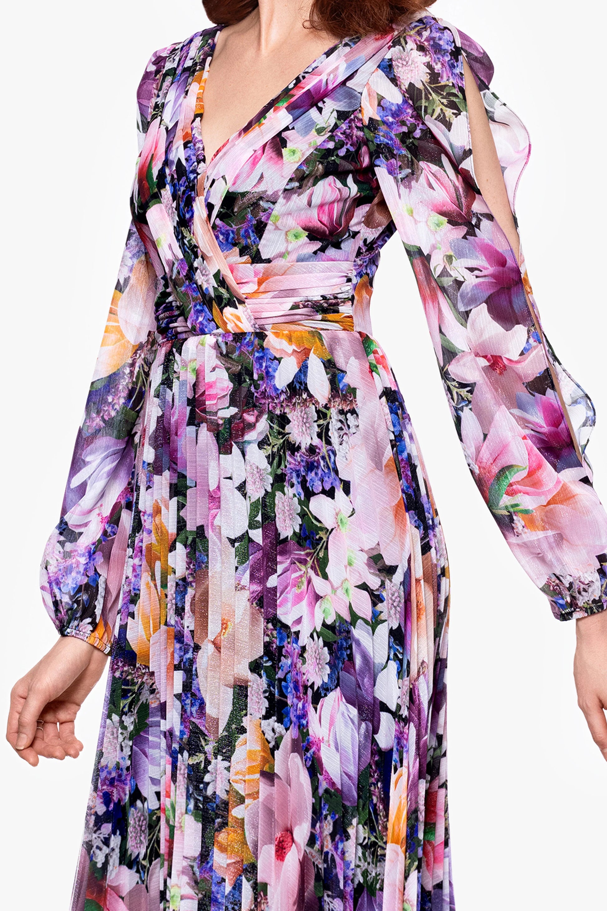 This enchanting gown features a wrap-style bodice and billowy long sleeves, creating a timeless silhouette. Perfect for garden parties or formal occasions, its flowing skirt enhances every movement with grace and charm.