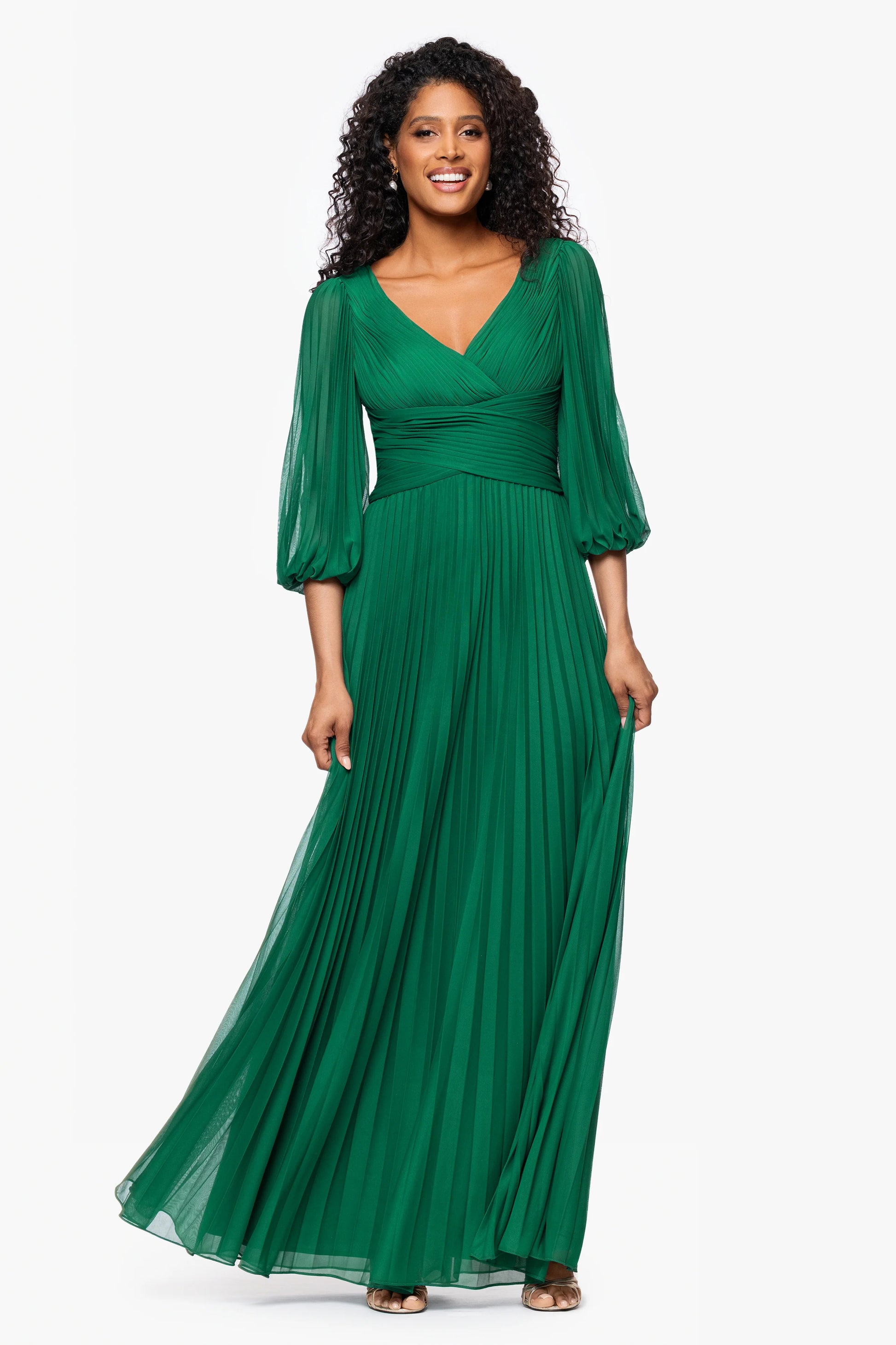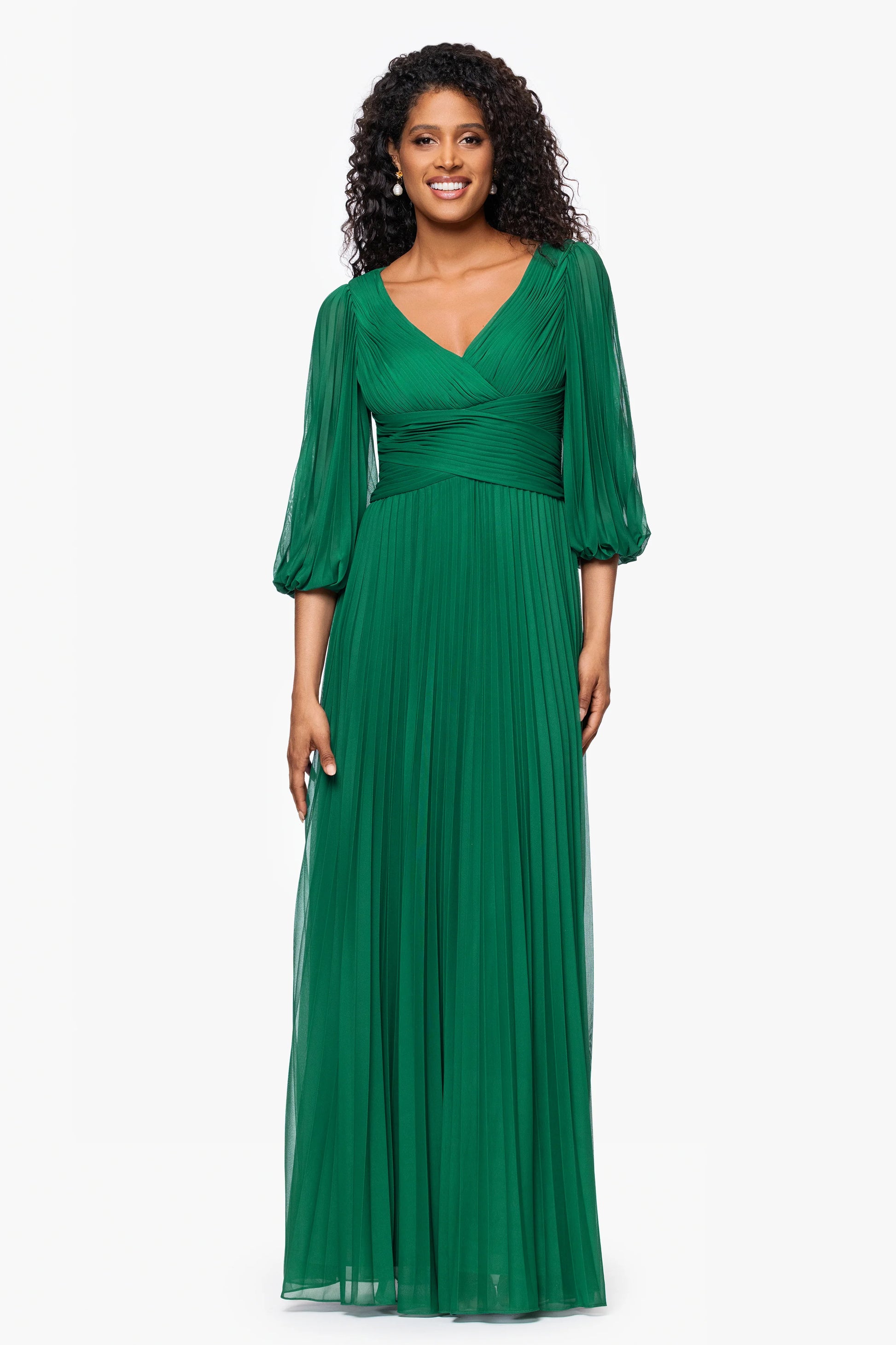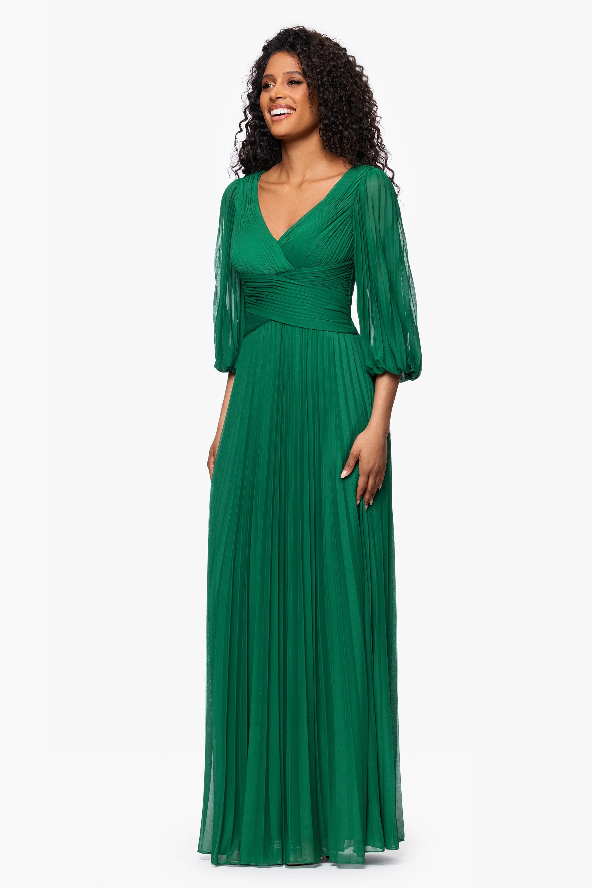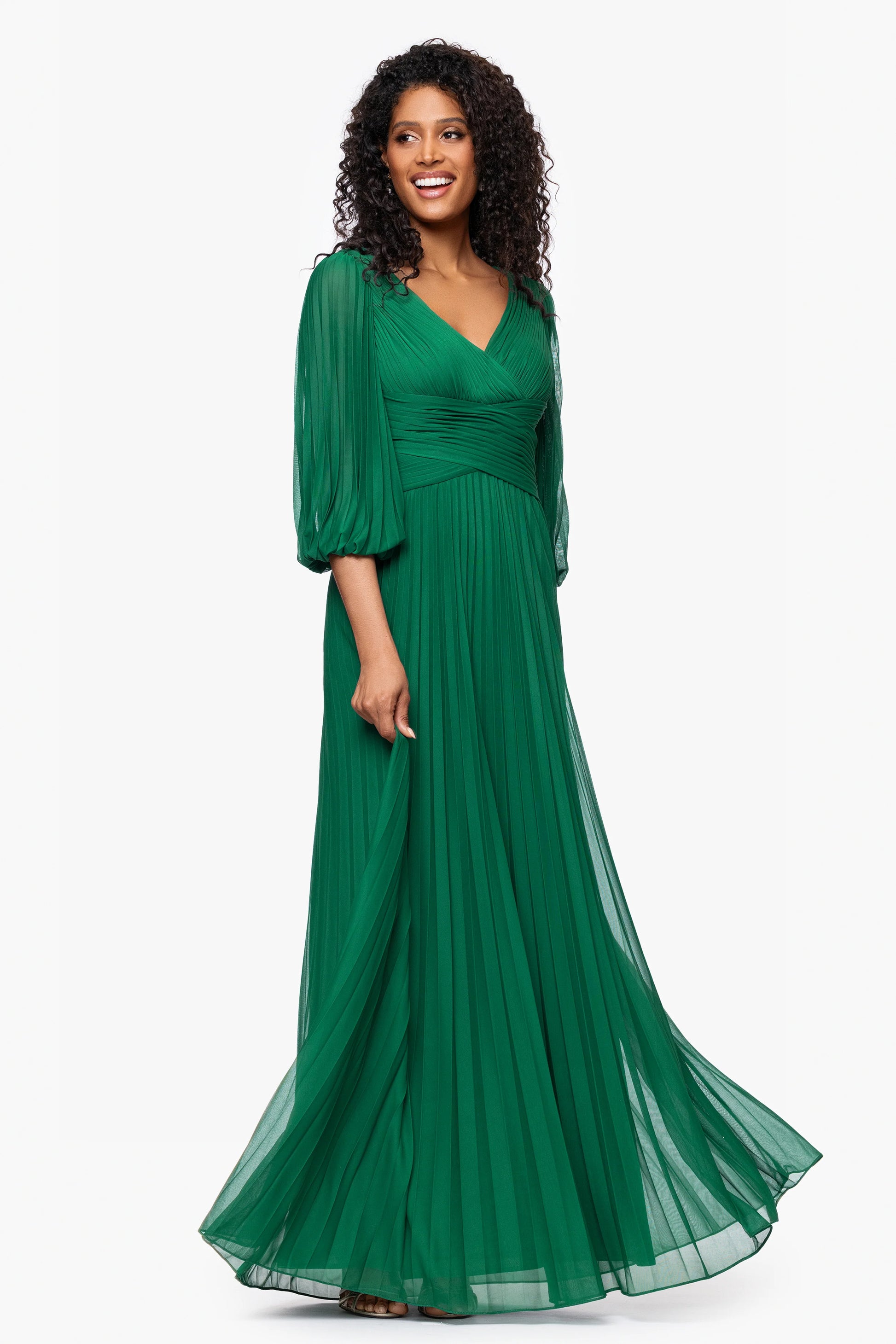Make an unforgettable entrance in this pleated gown featuring a V-neck, flattering waist, and airy 3/4 sheer sleeves. The flowing skirt creates soft movement with every step, perfect for weddings, galas, and timeless special occasions.