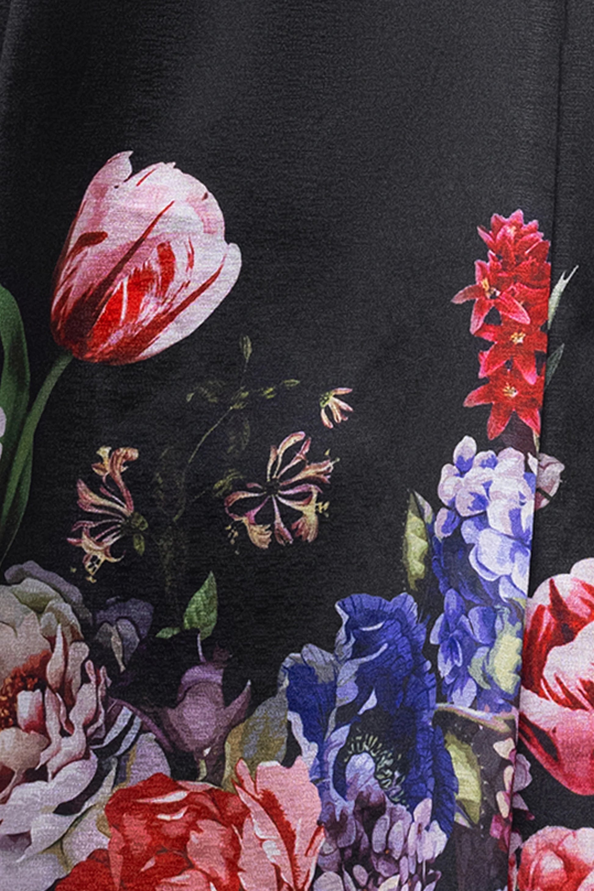 Romantic and refined, this off-the-shoulder gown features elegant pleated satin across the bodice and a full A-line skirt adorned with a vibrant floral print. The tea-length hem adds timeless charm, perfect for garden weddings and spring soirées.